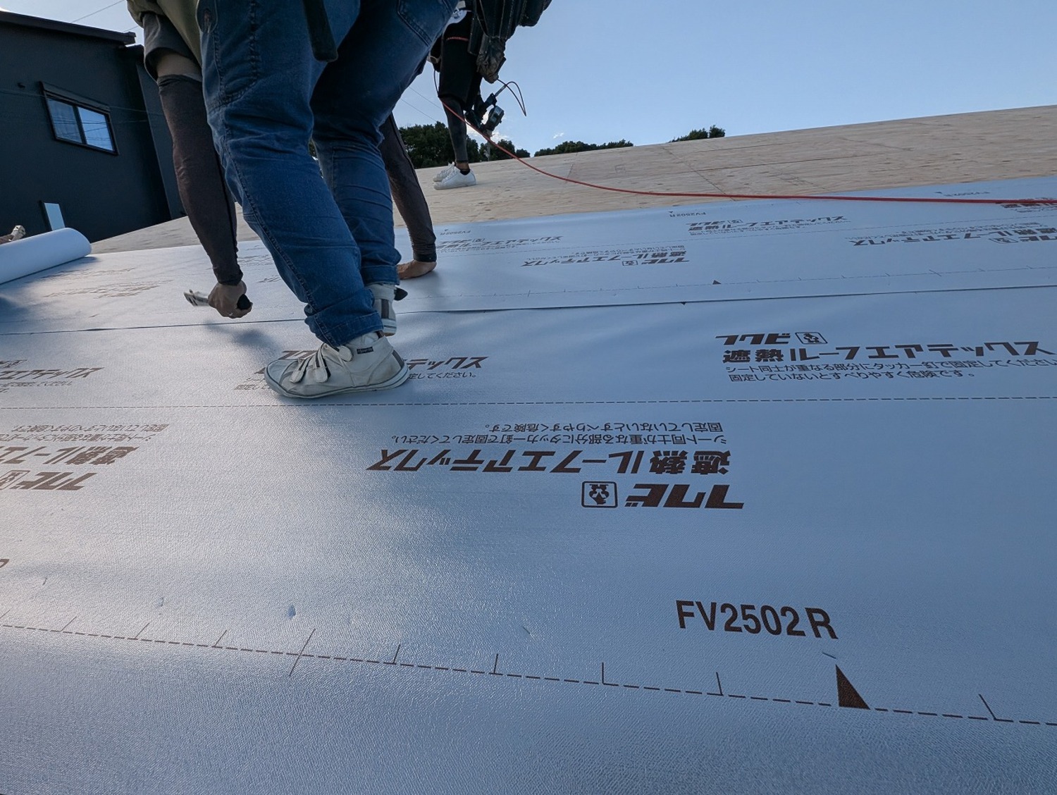 野地板合板の上には遮熱ルーフィングを貼っていきます。通常ゴムアスルーフィングが使用されることが多いと思いますが、カワイ建築工房ではこちらを使用します。