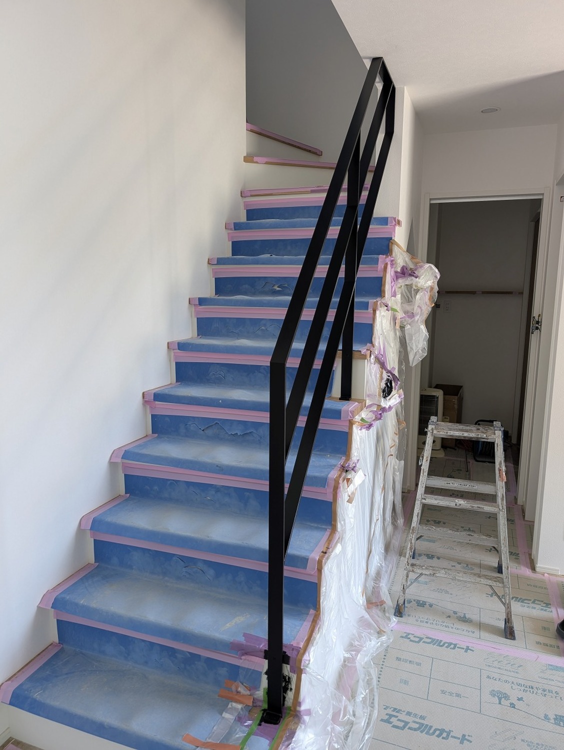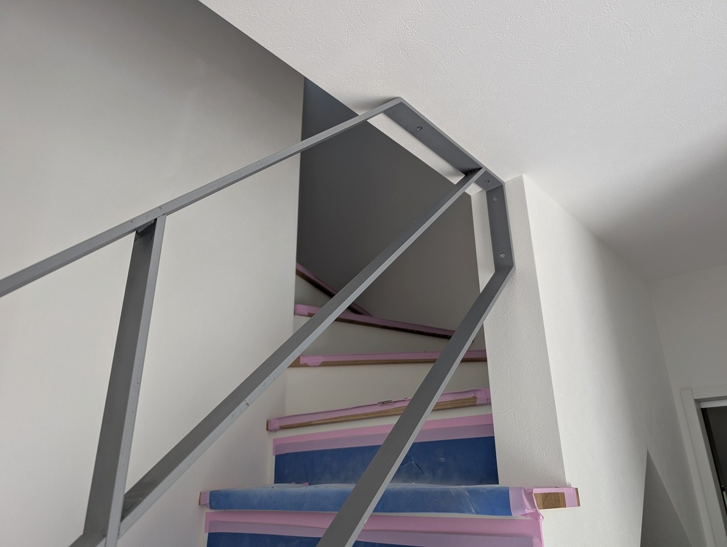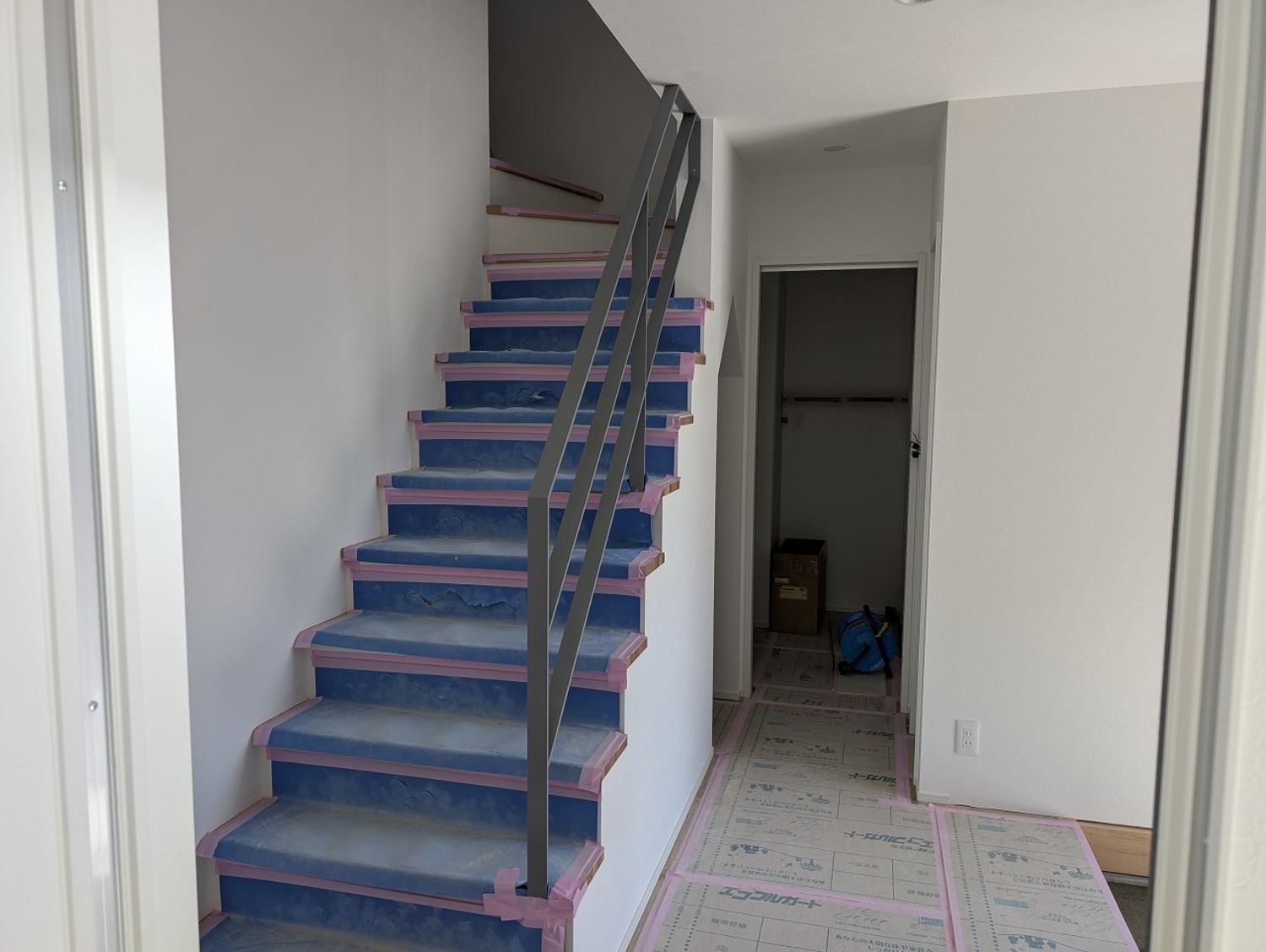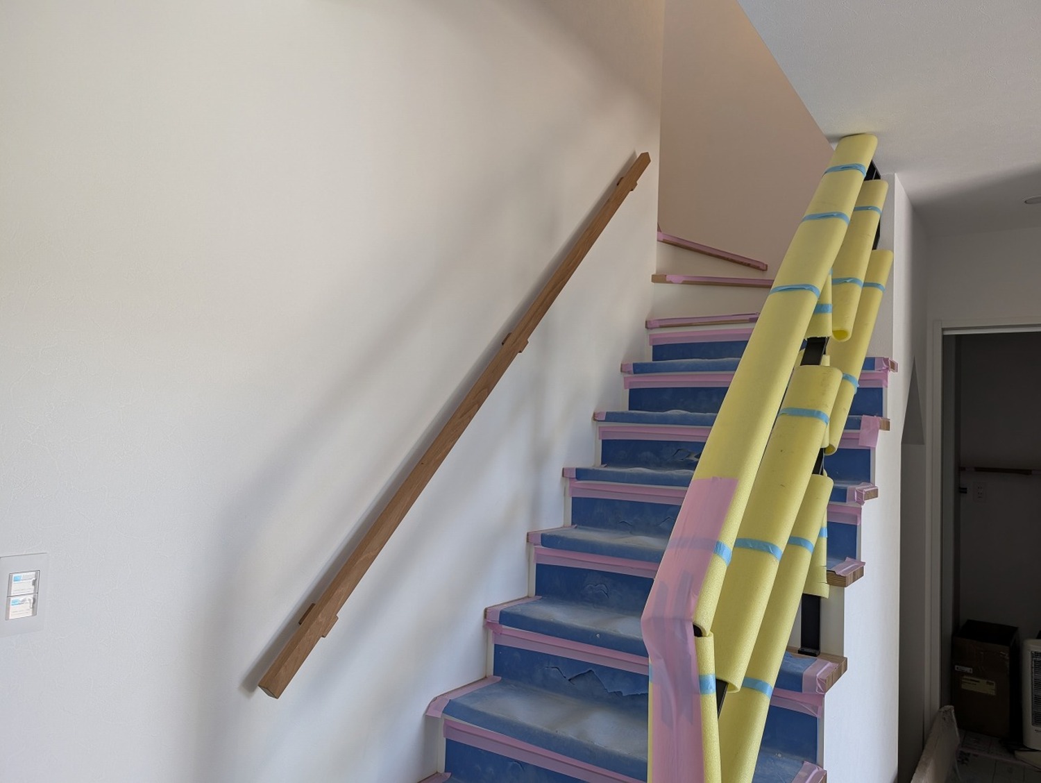玄関の壁際には、無垢の手すりが付きました。玄関から入って一番に目に入るシンボルの階段です。カッコよく仕上がったと思います。