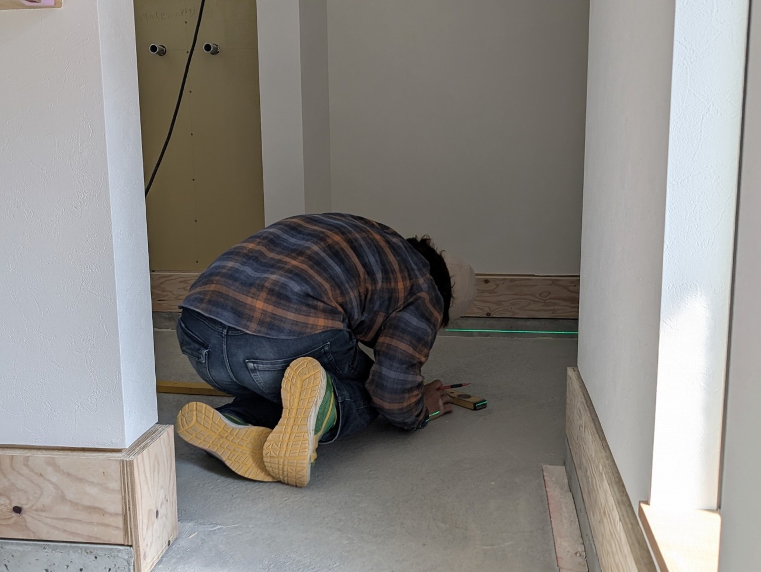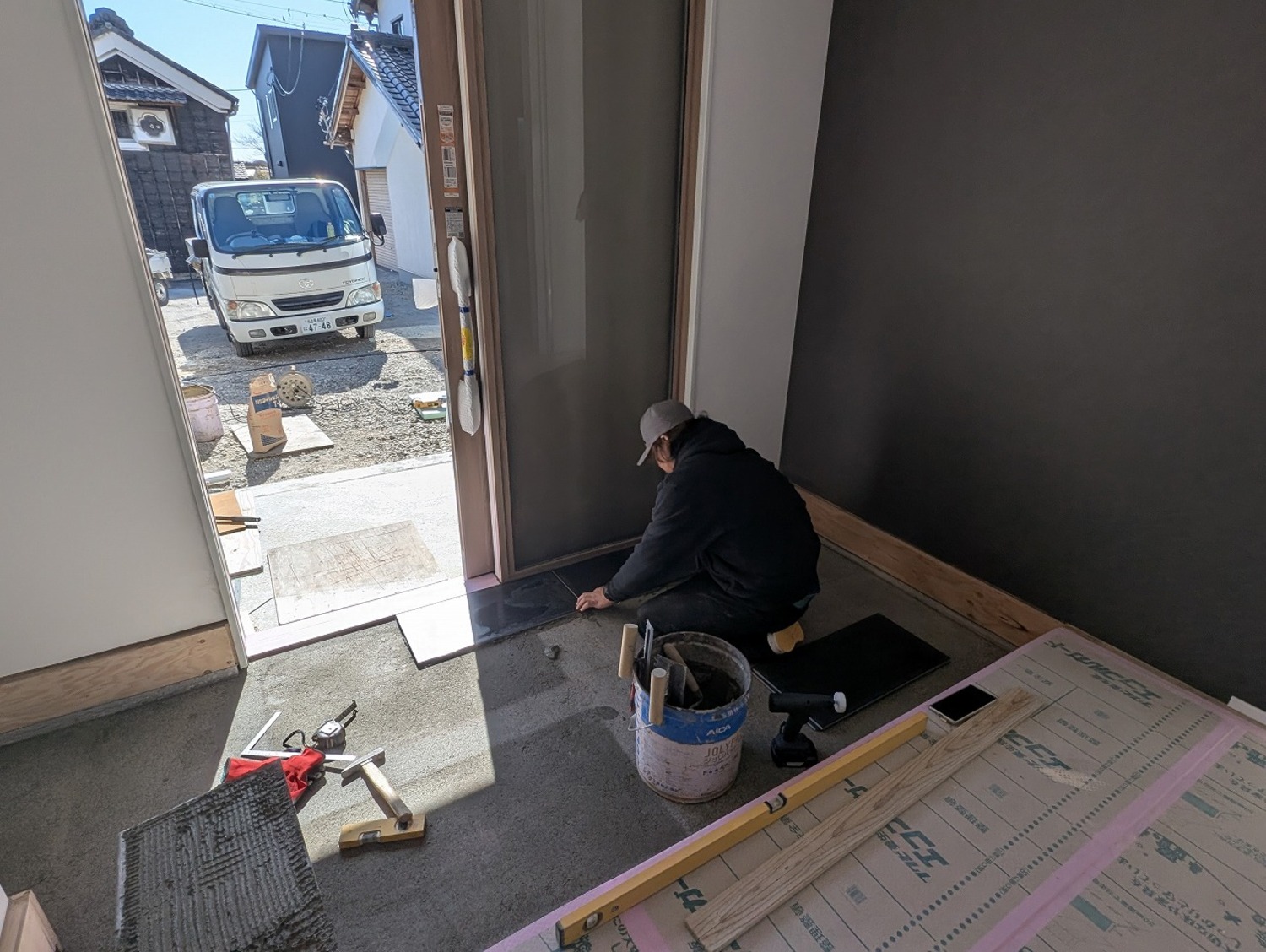 玄関の土間にタイルを貼る作業が始まりました。タイル屋さんが水平を確認しながら、割り付け作業を行っています。