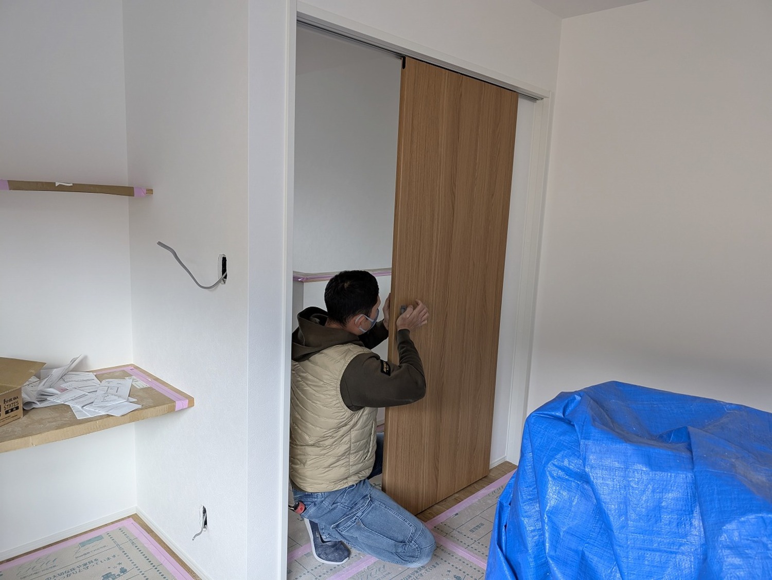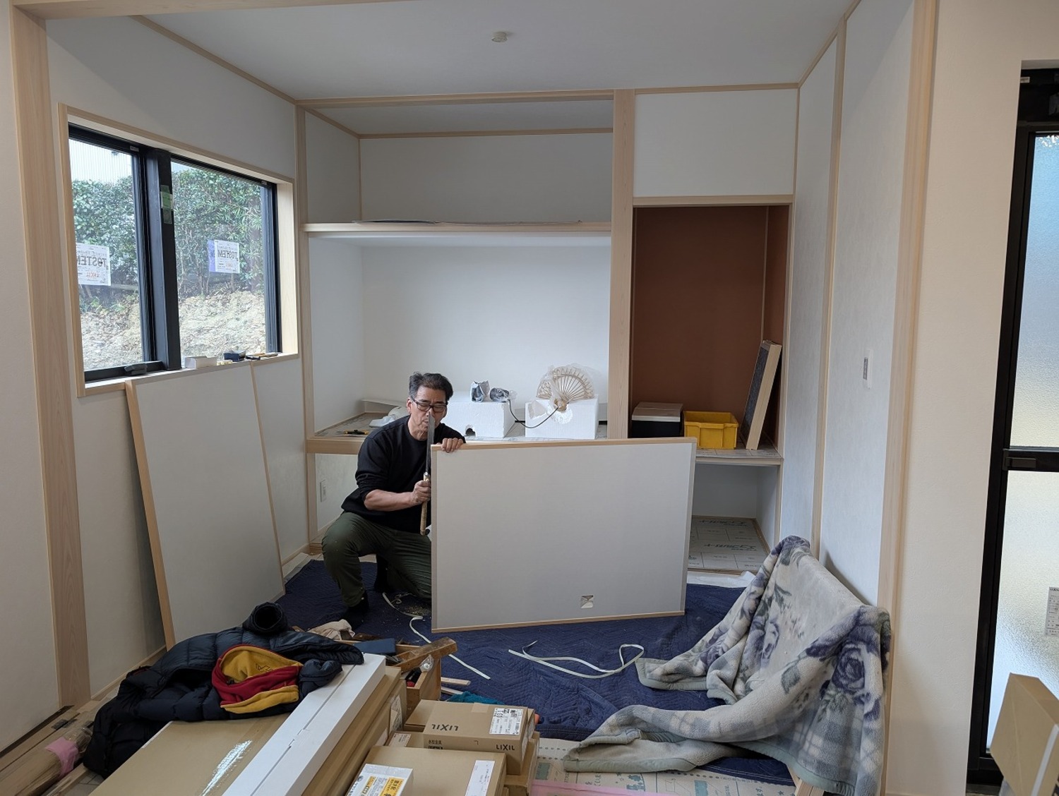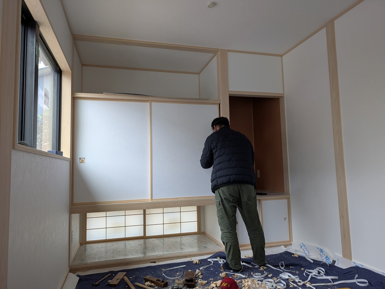 下には地窓、上には神棚があるので、押入の鴨居・敷居を入れる作業は、一苦労だったようです。