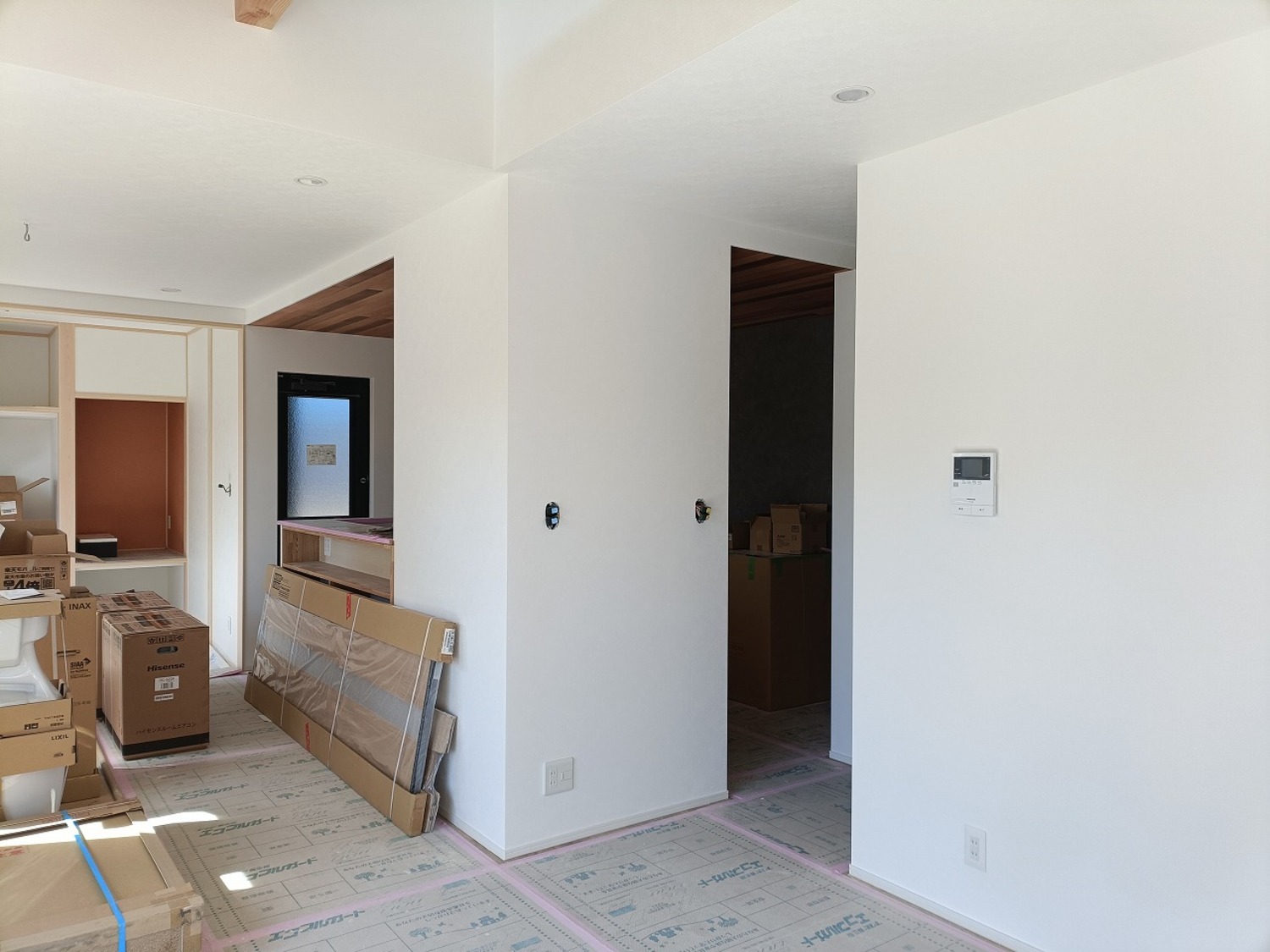 大工さんが、プラスターボードを張っています。壁下地が仕上がって間仕切壁が出来てくると、お部屋の雰囲気が多端に出てきます。