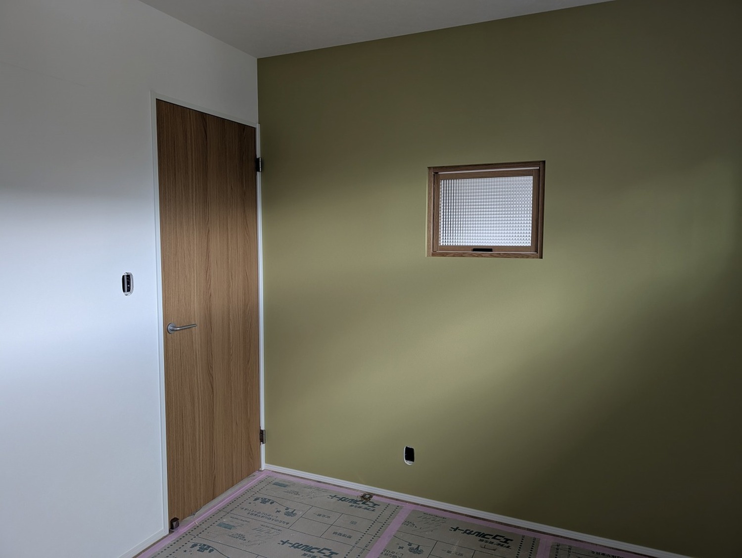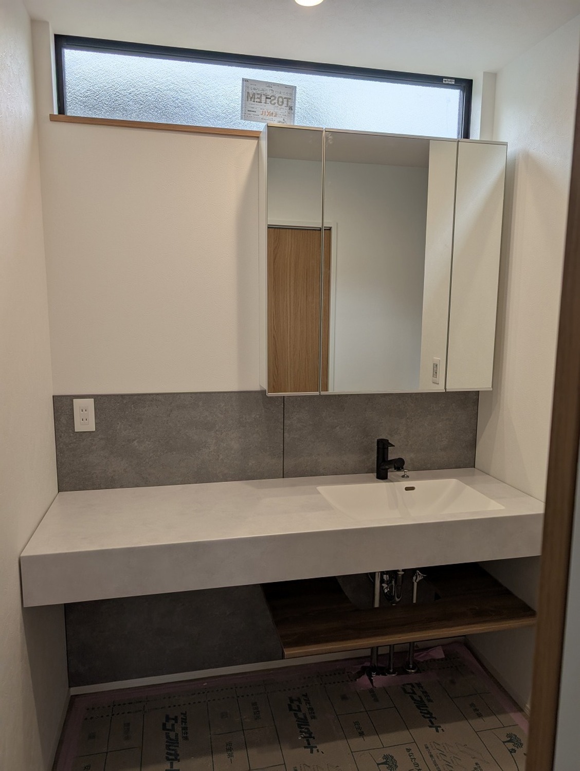 汚れや濡れが心配されるお部屋は、汚れに強いタイプの壁紙しました。クロス屋さんは貼るのが大変になるので一苦労だったようです。でもとてもキレイに仕上げてくれました。