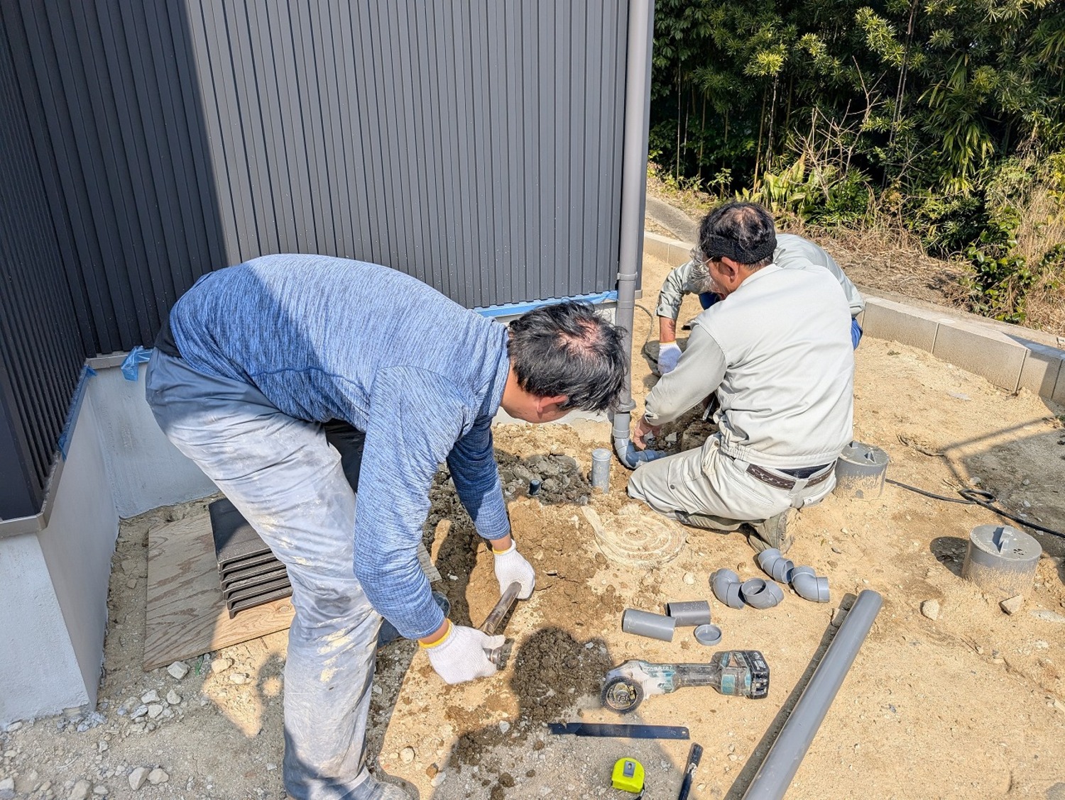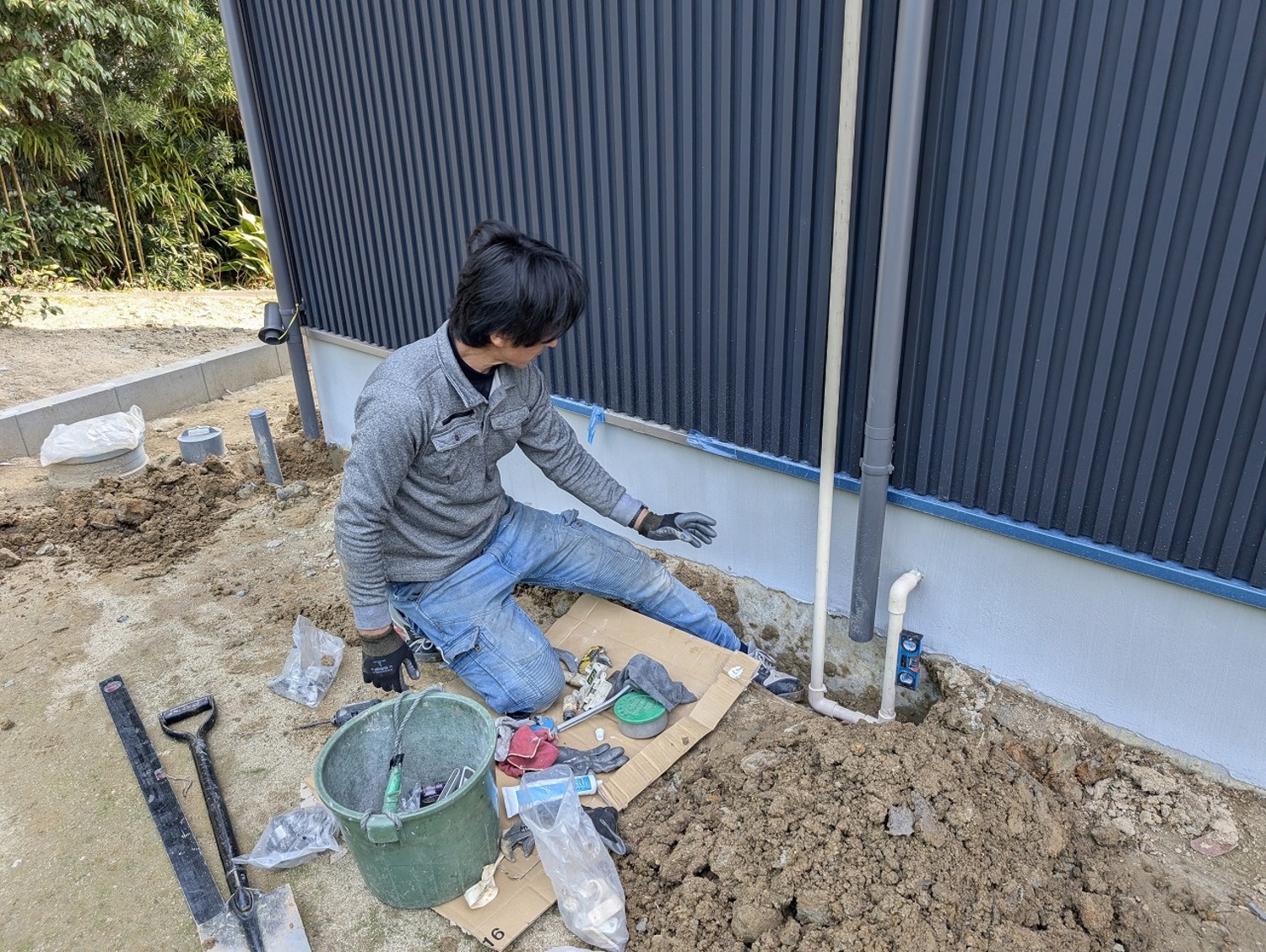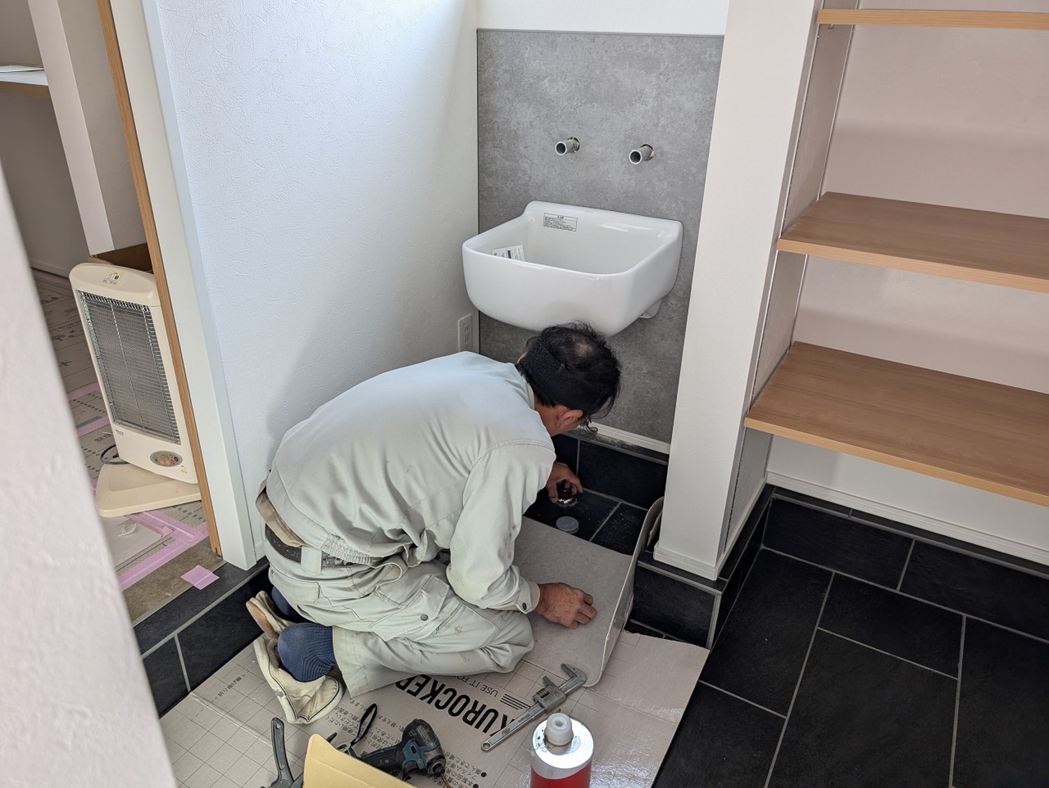 設備屋さんが、水回りの設備の設置に来てくれています。土間には、外物洗いが便利なスロップシンクを設置します。