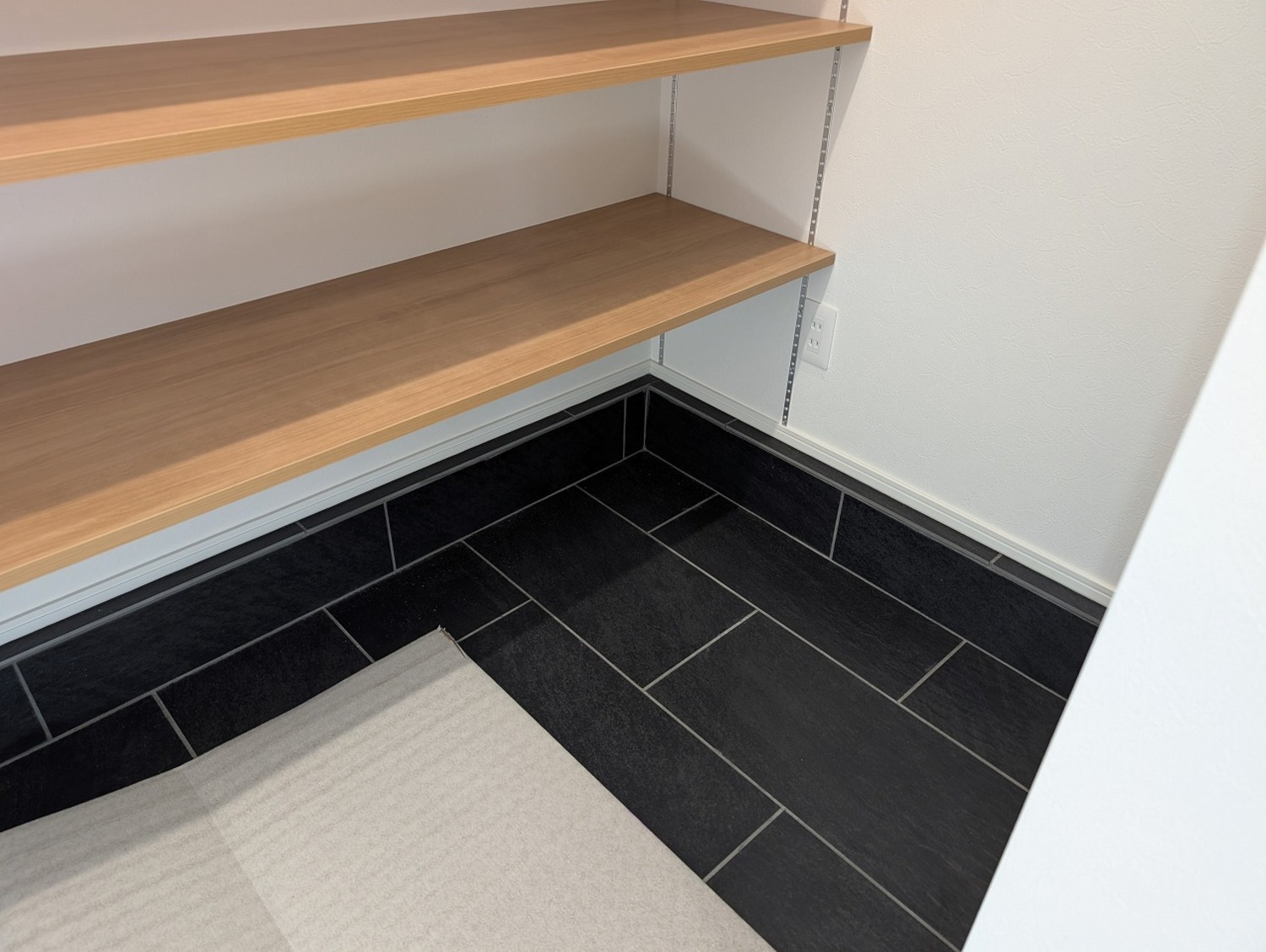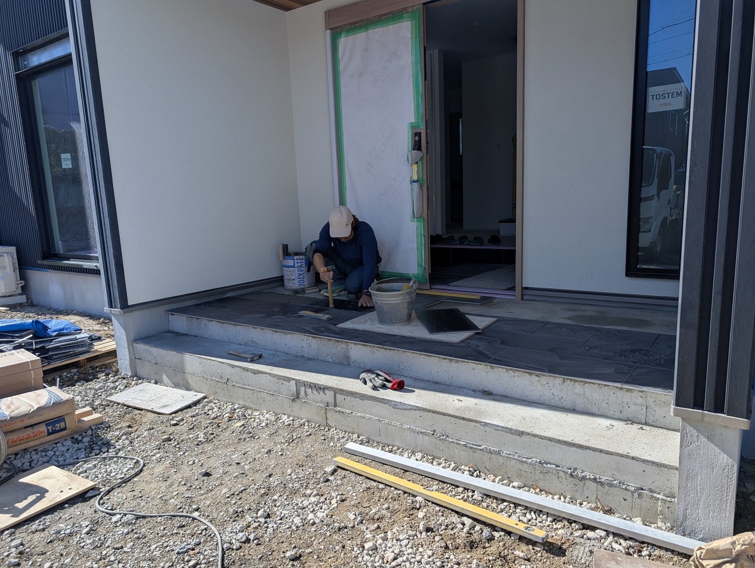 玄関ポーチ部分のタイル貼りが進んでいます。基礎の立ち上がり厚さが170cmに変わり分厚くなった分土間廻りのタイル貼り作業は、細かな作業が増えて大変だったようです。でもキレイに仕上げてくれました。