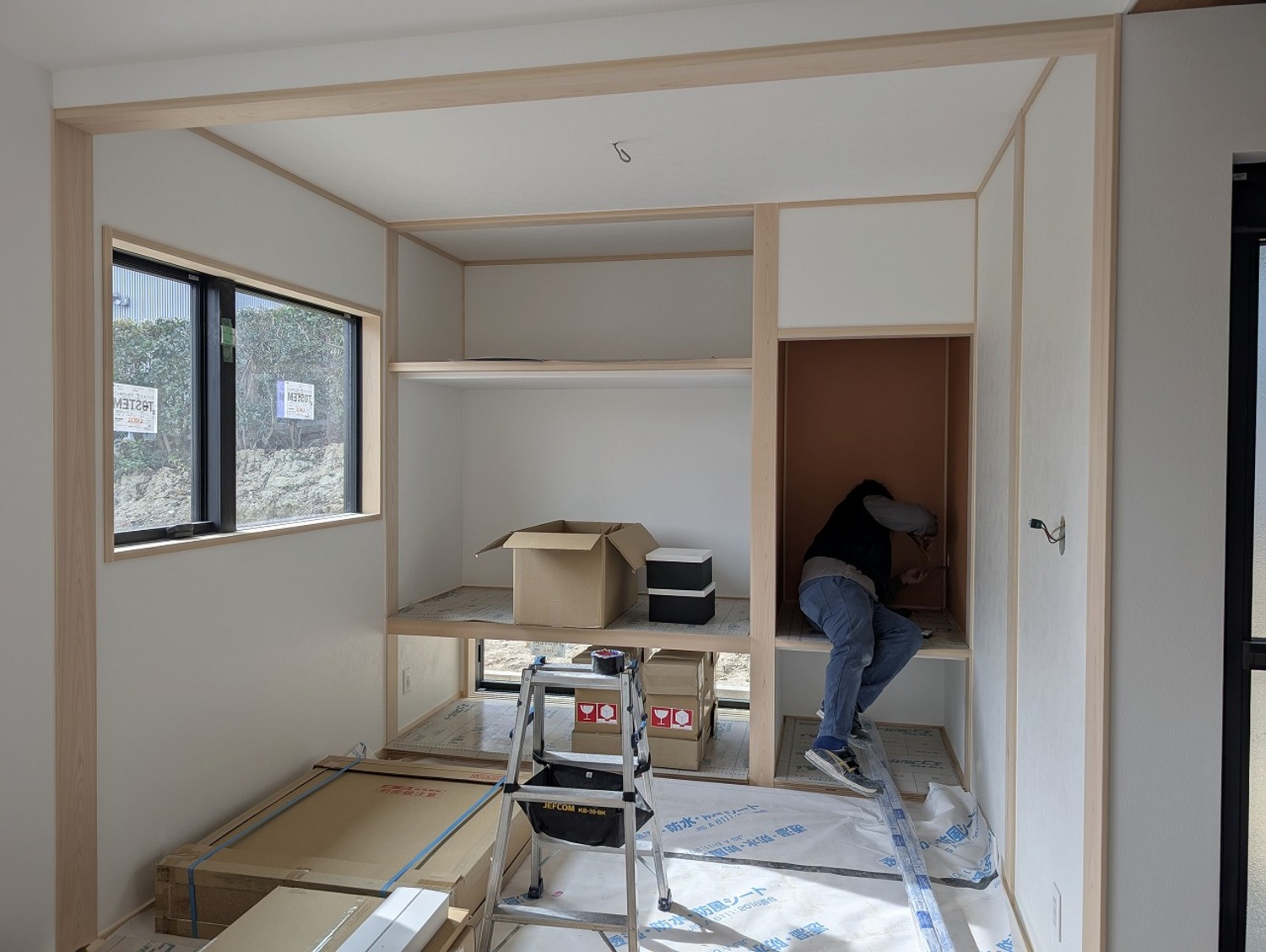 押入部分と、仏間がイイ感じに仕上がってきました。和室らしい雰囲気を出すために、今回は真壁風の付け柱を使用しました。