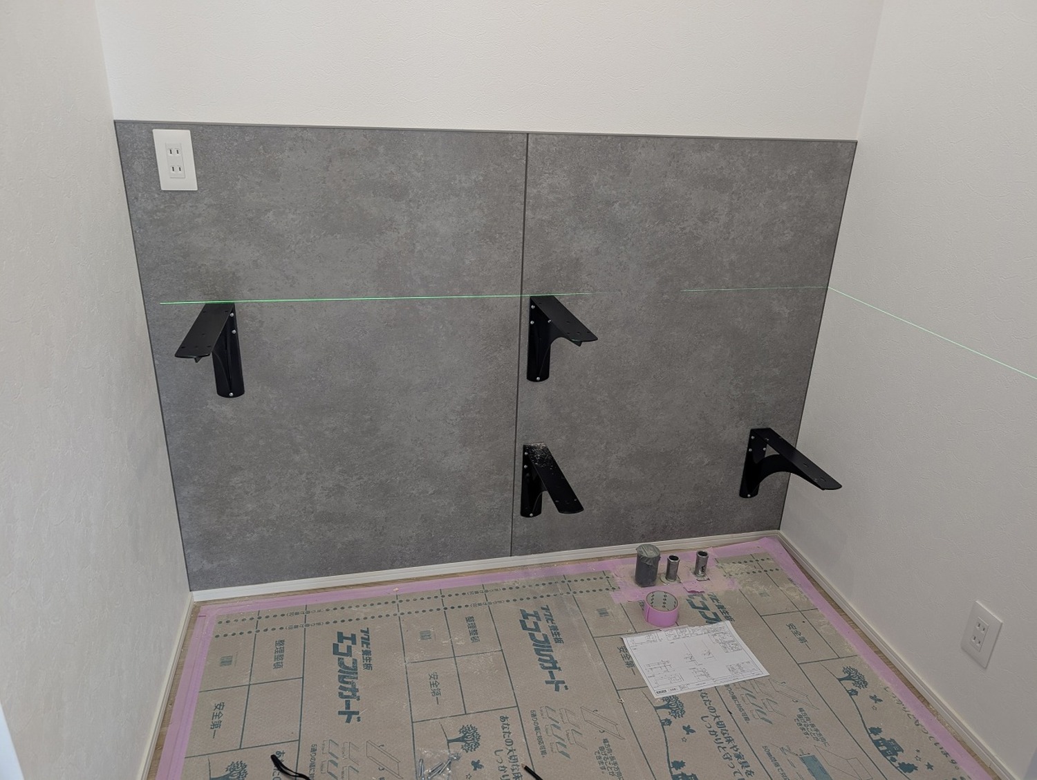 キッチンカウンター、いい感じになりそうです。今回は、キッチン横にも腰壁が来るようになっています。