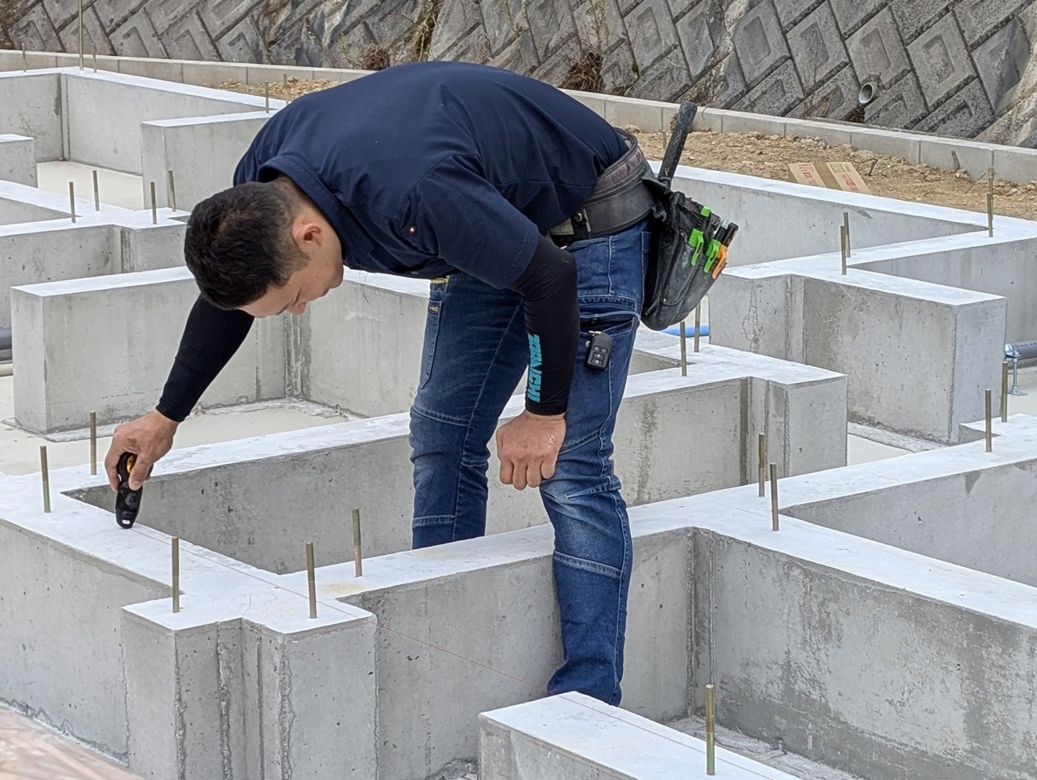設備工事が終れば、大工さんが土台敷き工事に入ります。墨出しをしてくれています。