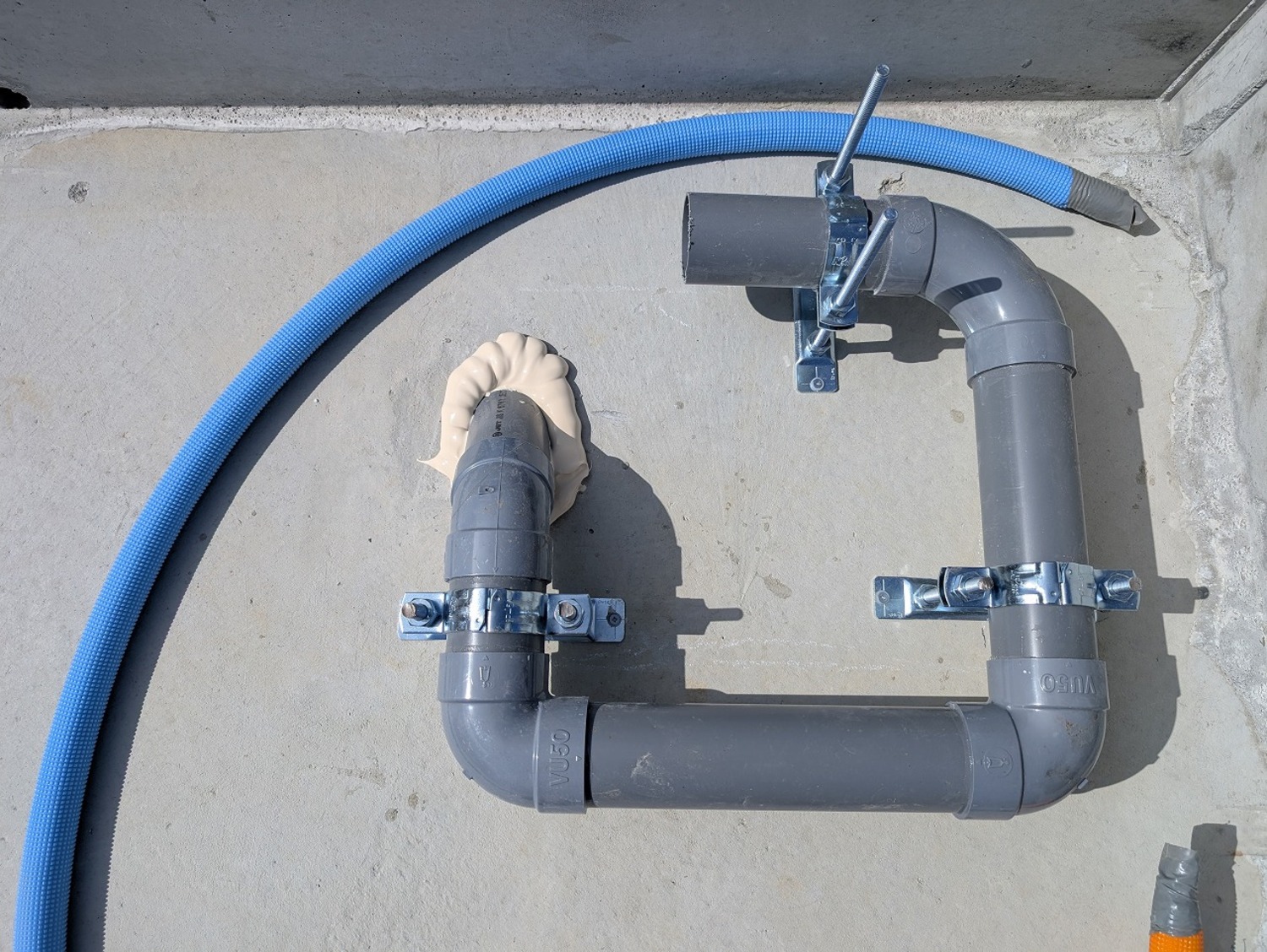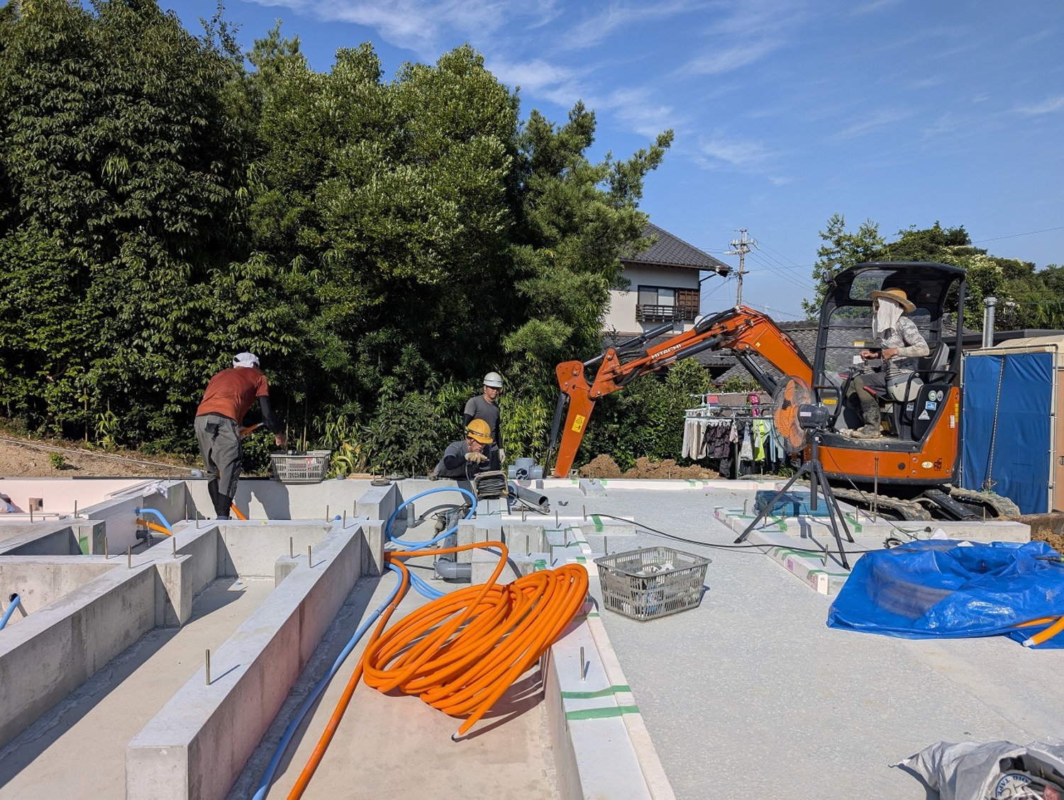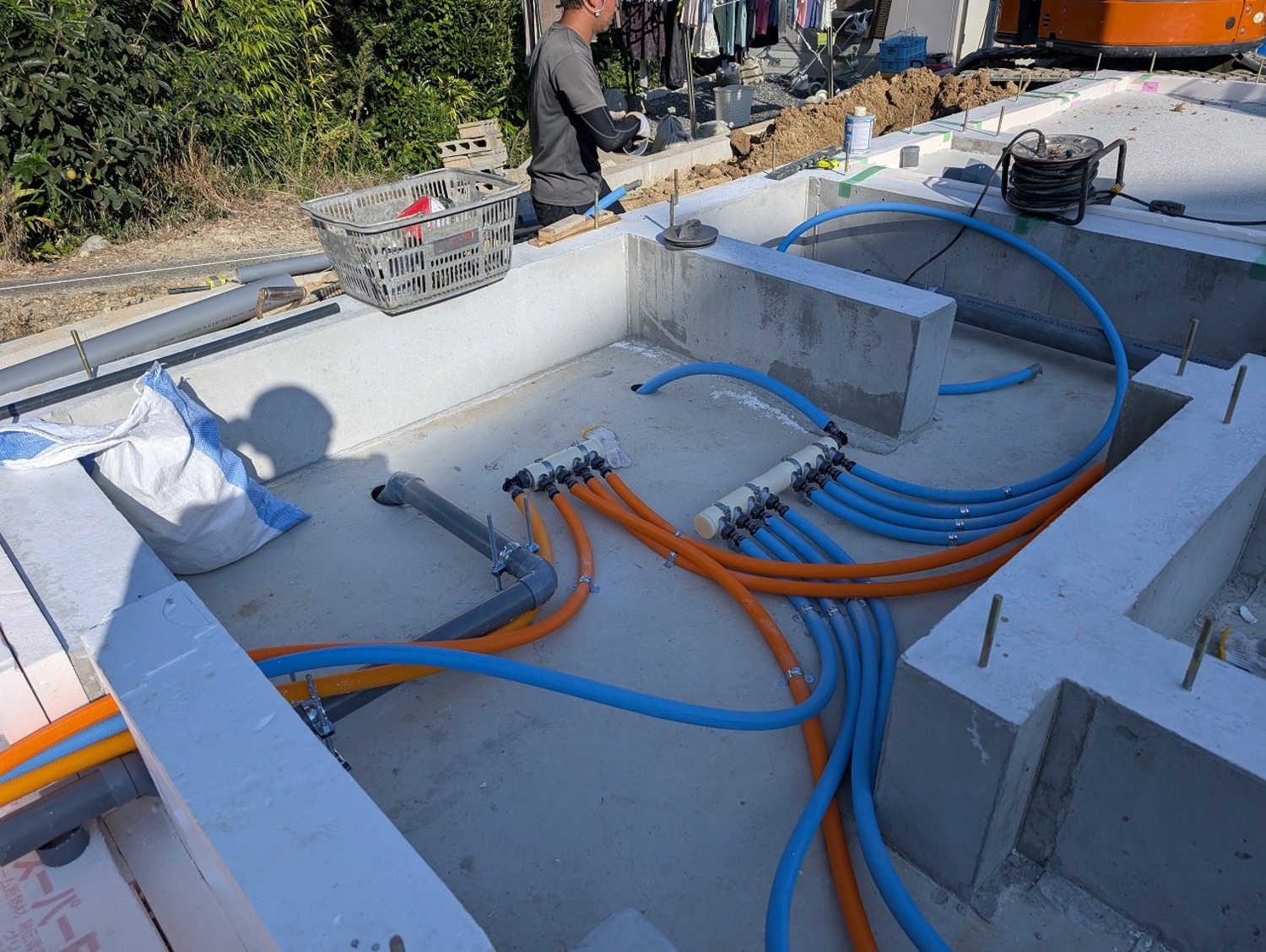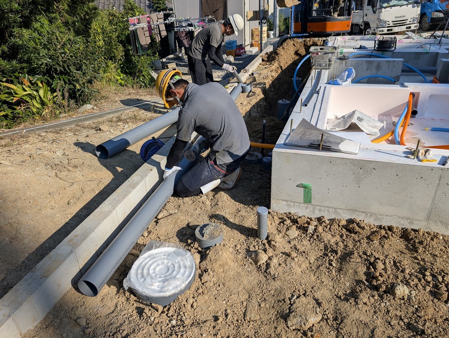 基礎が終われば、設備屋さんが配管作業を行います。今回は建物周りの配管工事です。