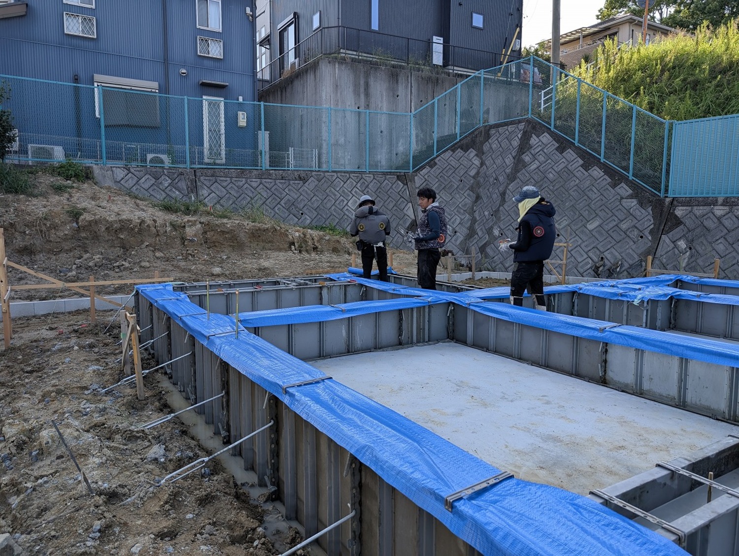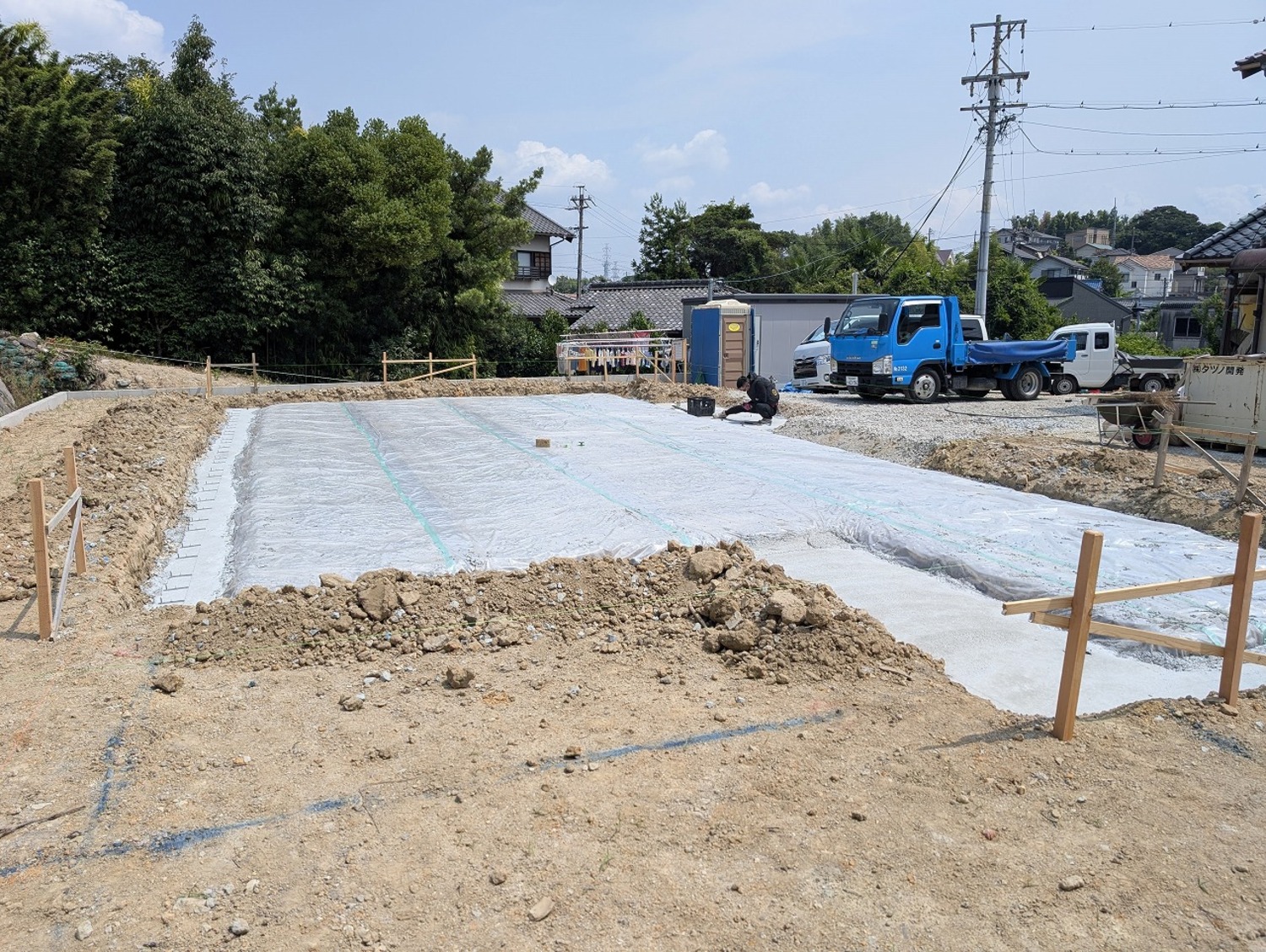 暑さで急激にコンクリートが乾かないように、ブルーシートで養生をしました。