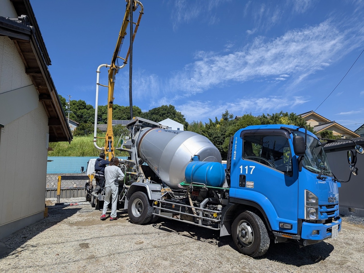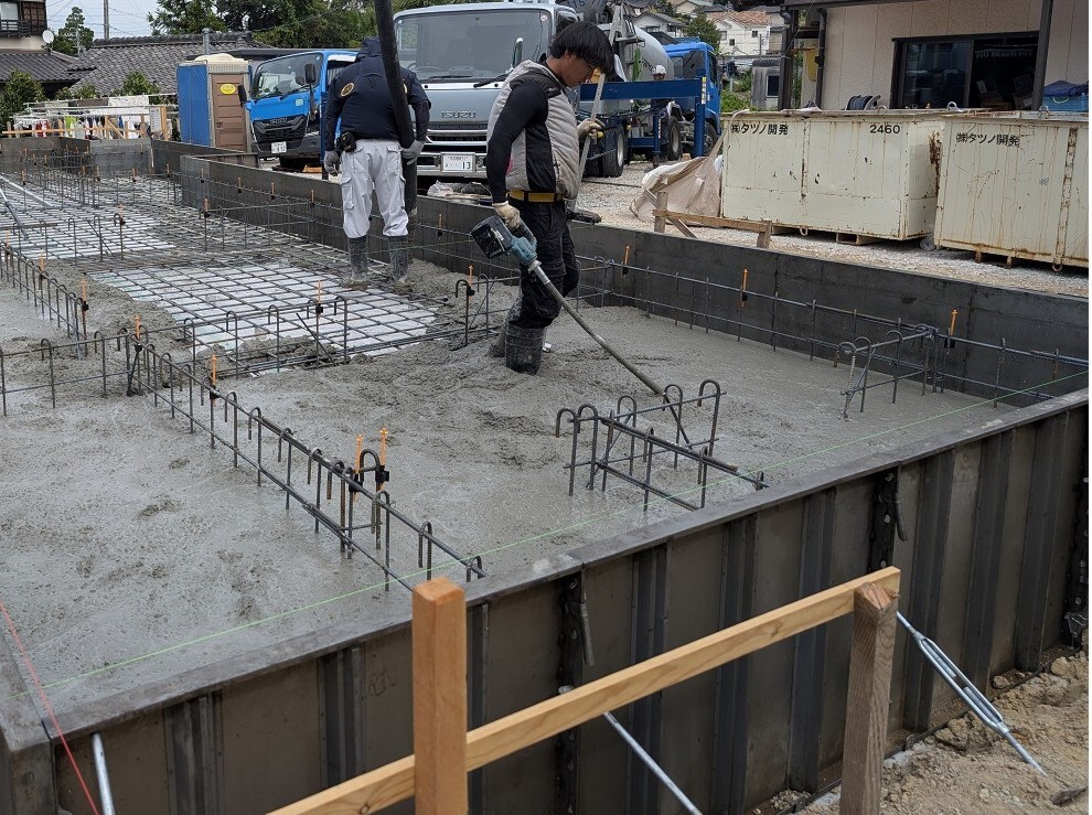 ポンプ車でコンクリートを流し込んだ後、バイブレーターで締め固めていきます。