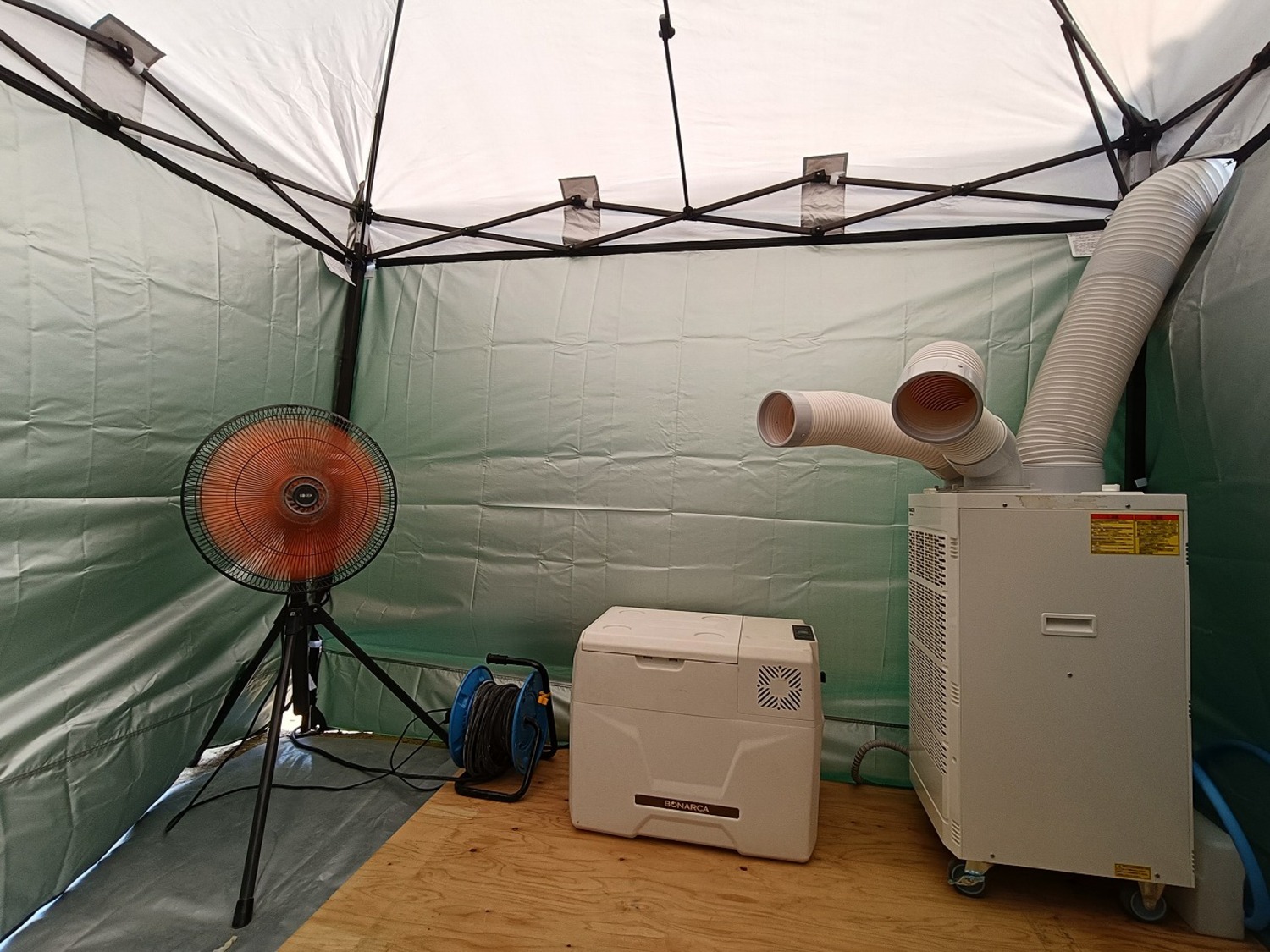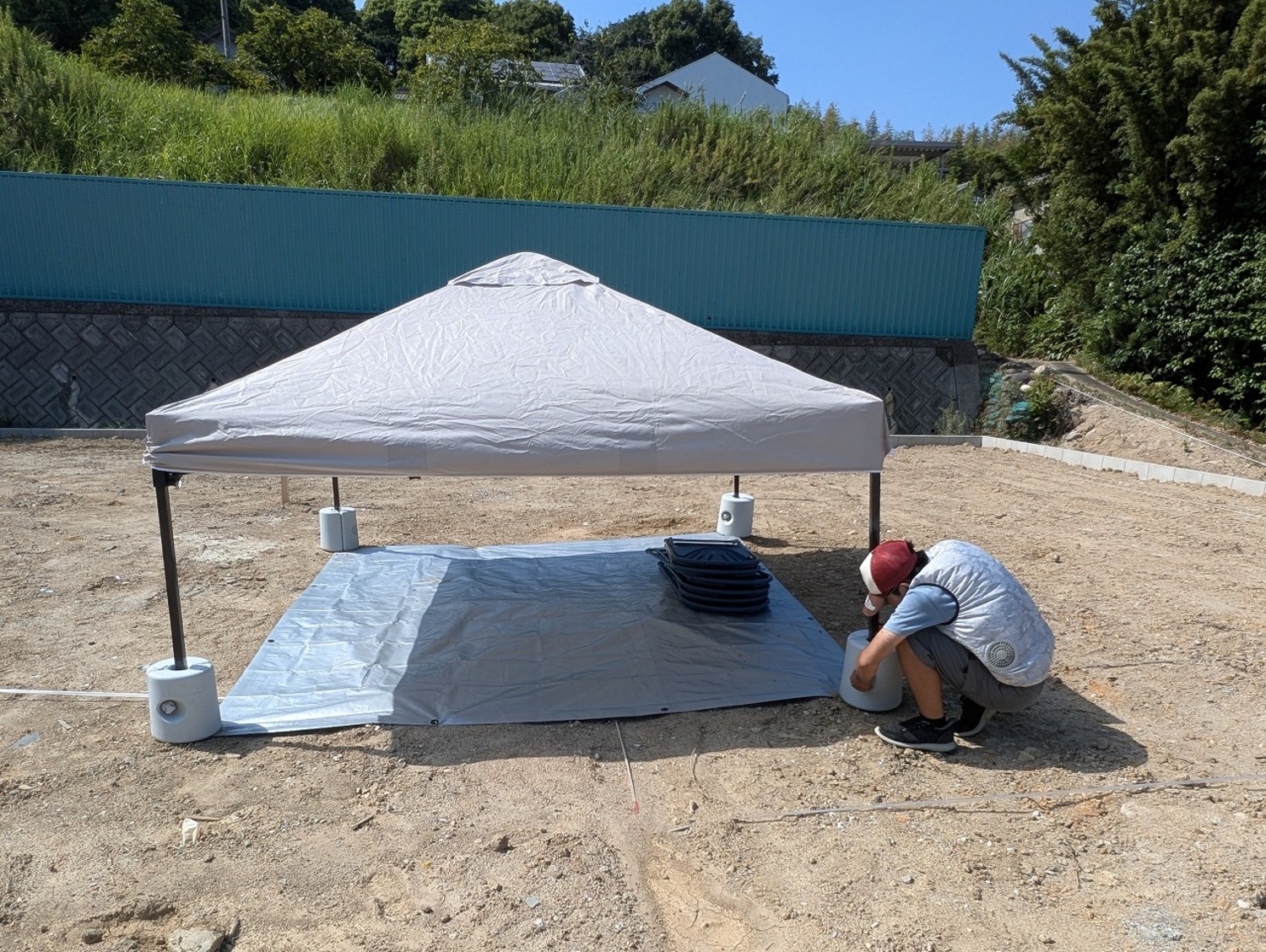 これから、日陰のないなか基礎工事が始まるので休憩スポットと作りました。ここ最近の夏の暑さは職人さんを苦しめる一つの要因なので、スポットクーラーやドリンクなど、やれるだけのことはやってみました。