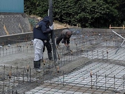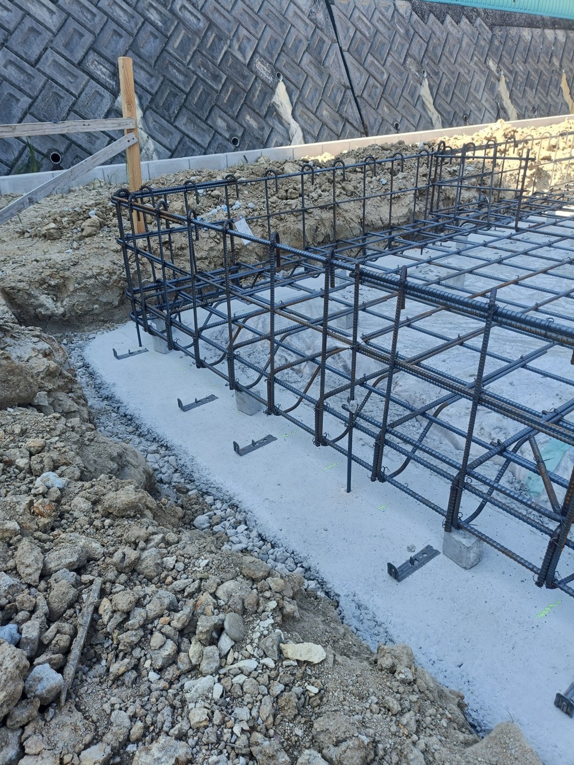 今回はフック付きの鉄筋を使用。コンクリートの被り厚さは、基礎屋さんとも何度も確認を取りつつ進めます。