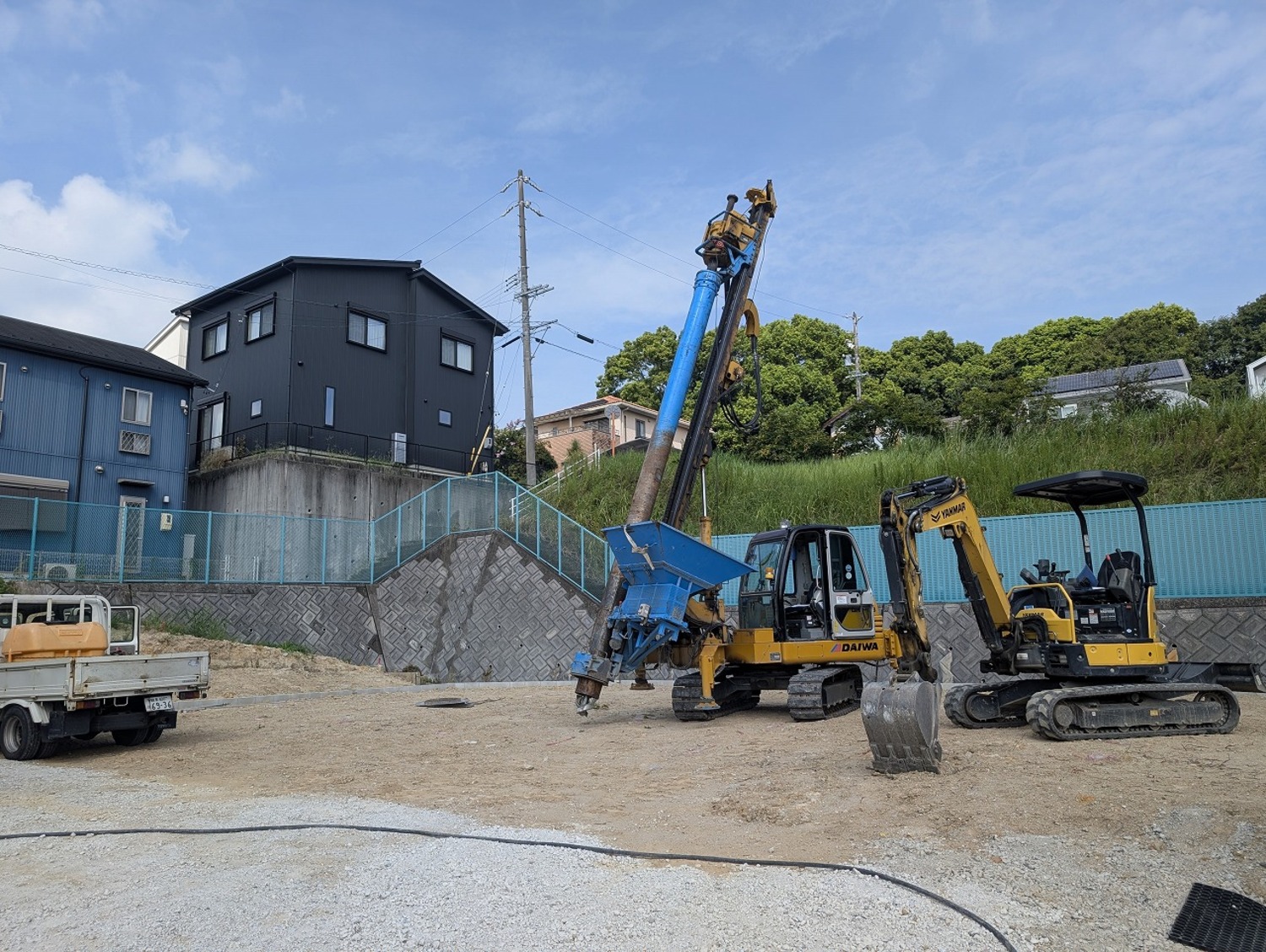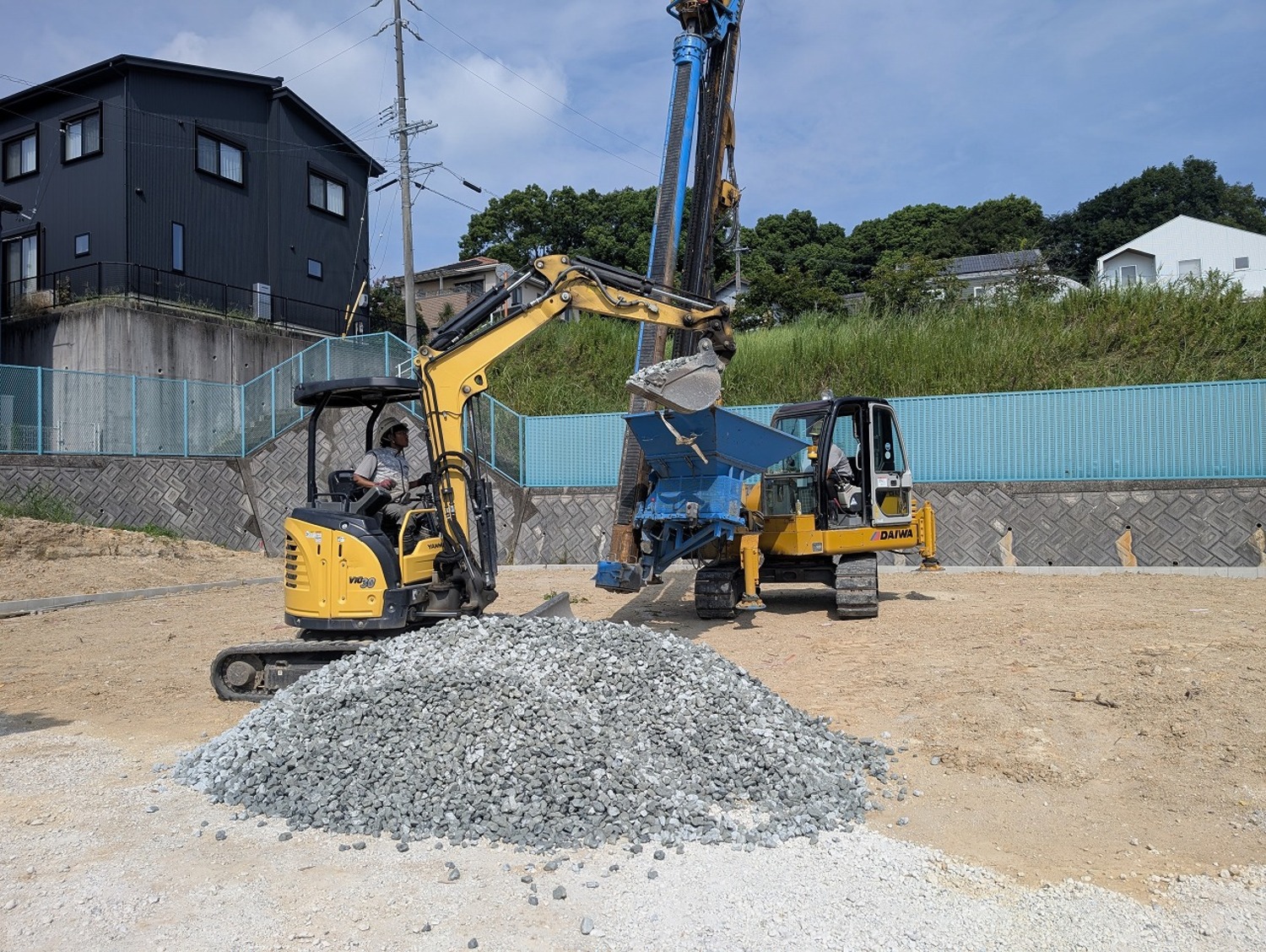 砕石を地面に詰め込んで形成したパイルを使い地盤を補強します。砕石を入れるのに、残土がでないありがたい工法です。