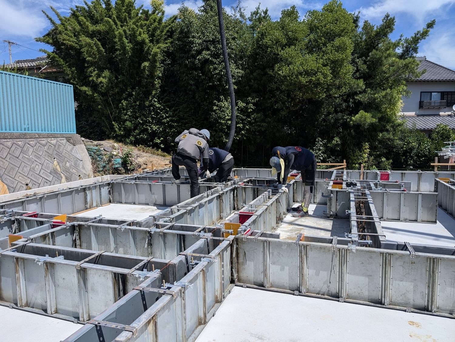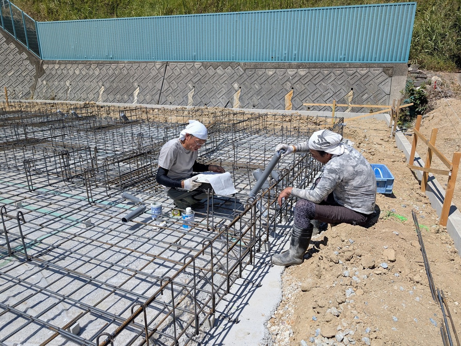 炎天下の中、鉄筋屋さんがドンドン鉄筋を組んでいきます。