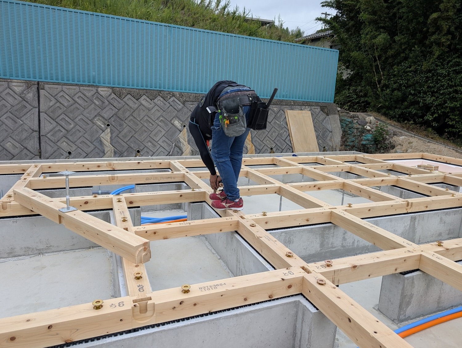 三尺ピッチに入れた大引の間に断熱材を入れていきます。