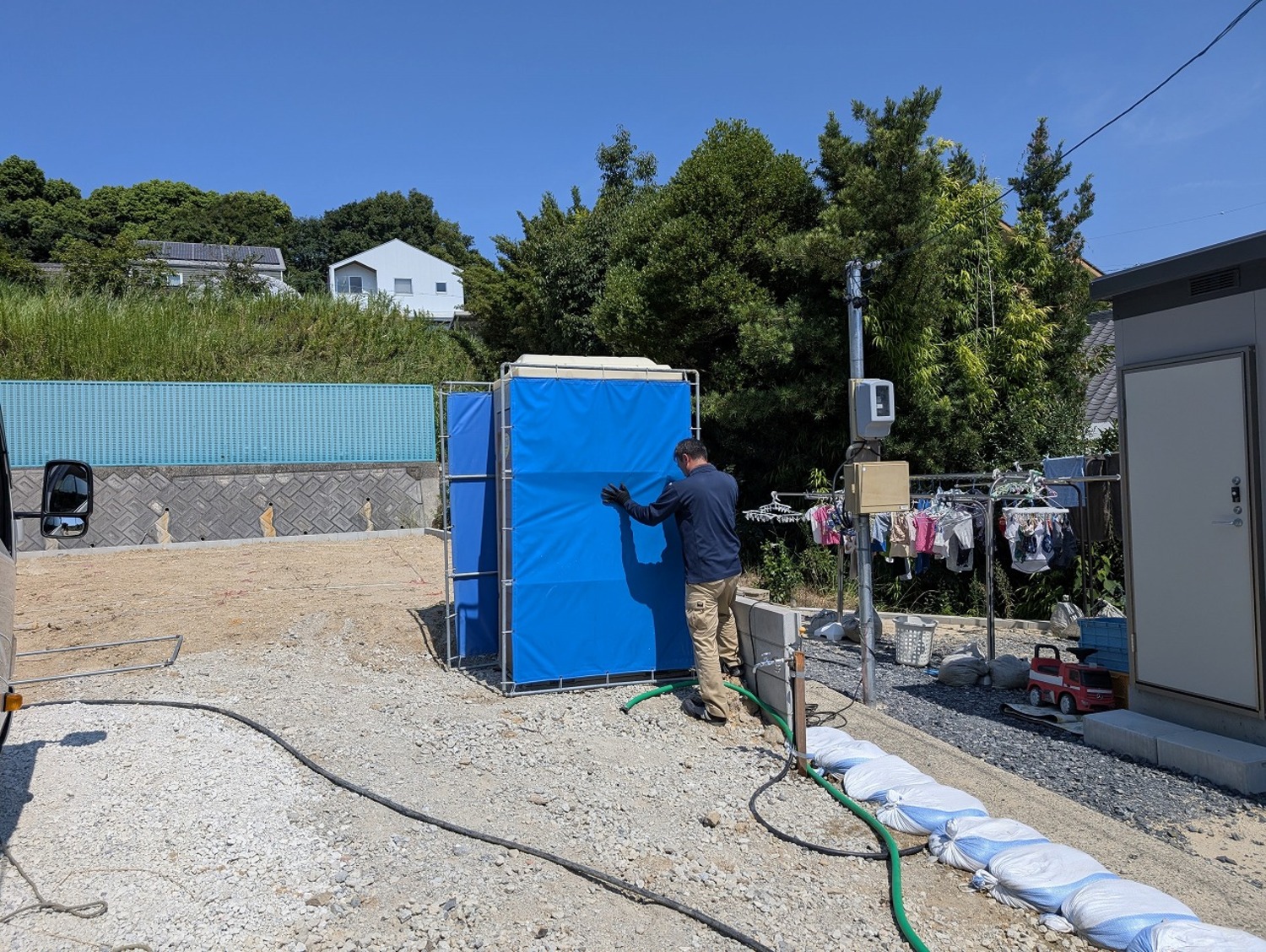 仮設トイレの設置を行いました。今回は水洗トイレを使用しています。