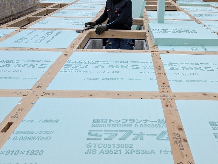 土間部分に断熱材を入れました。この上に土間コンクリートを入れていきます。