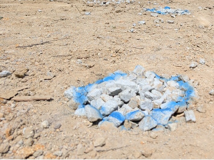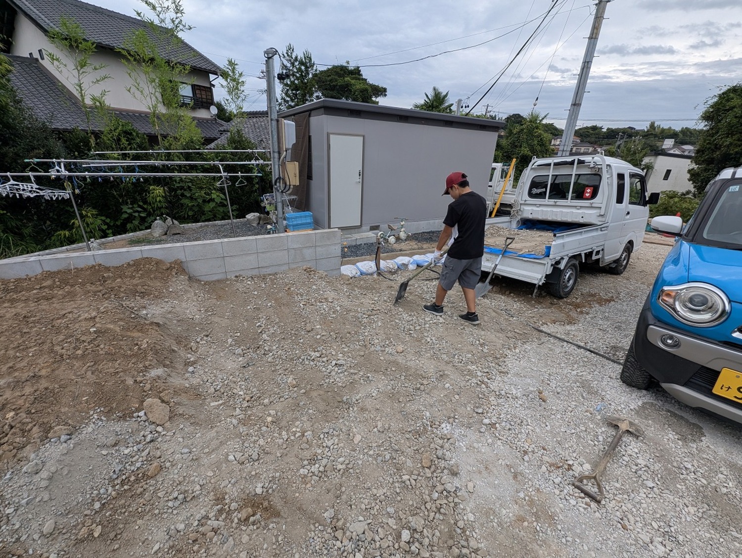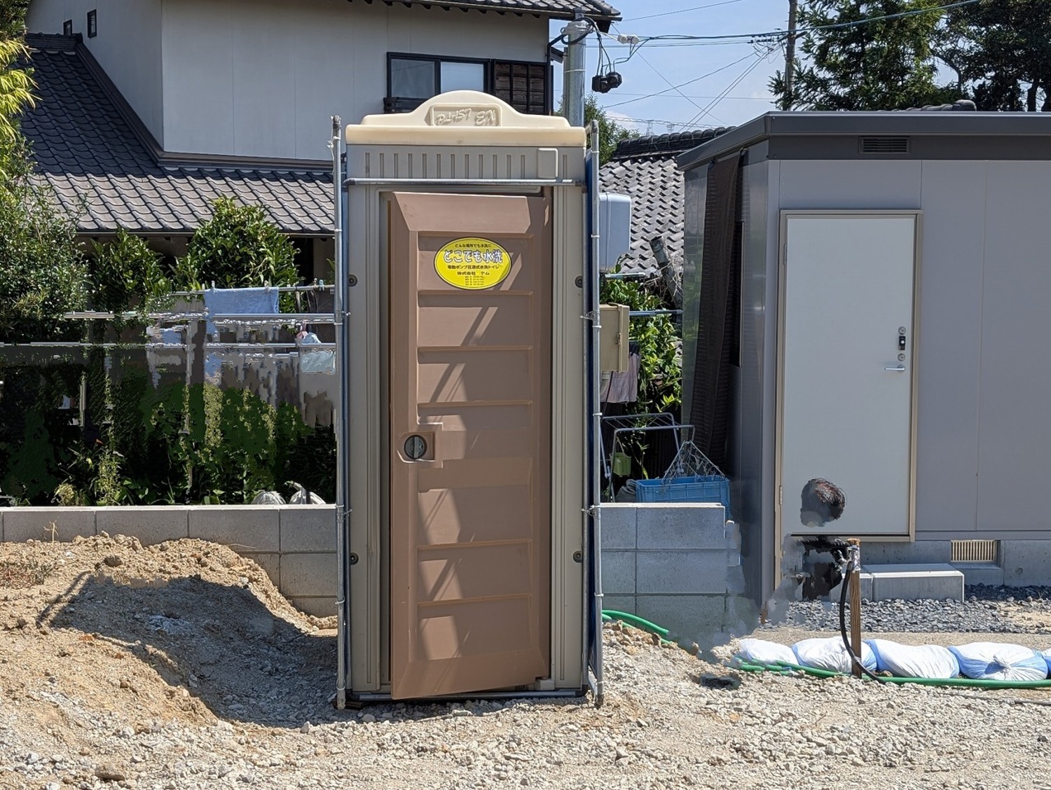 工事をするにあたり、まず仮設トイレの設置を行います。トイレを置く場所に砕石をひいて平らにしました。