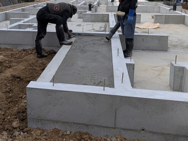土間コンクリートを流し入れ、表面を抑えていきます。