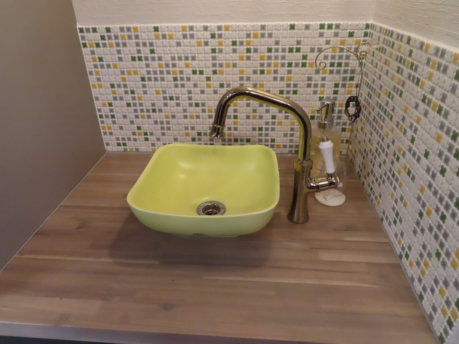 完成写真かわいくって見切り発車で買ってしまった手洗いボールを、うまく活用することができました。ボールの色に合わせて黄色ベースのモザイクタイルを貼り、ゴールドの水栓金具で統一感をだしました。