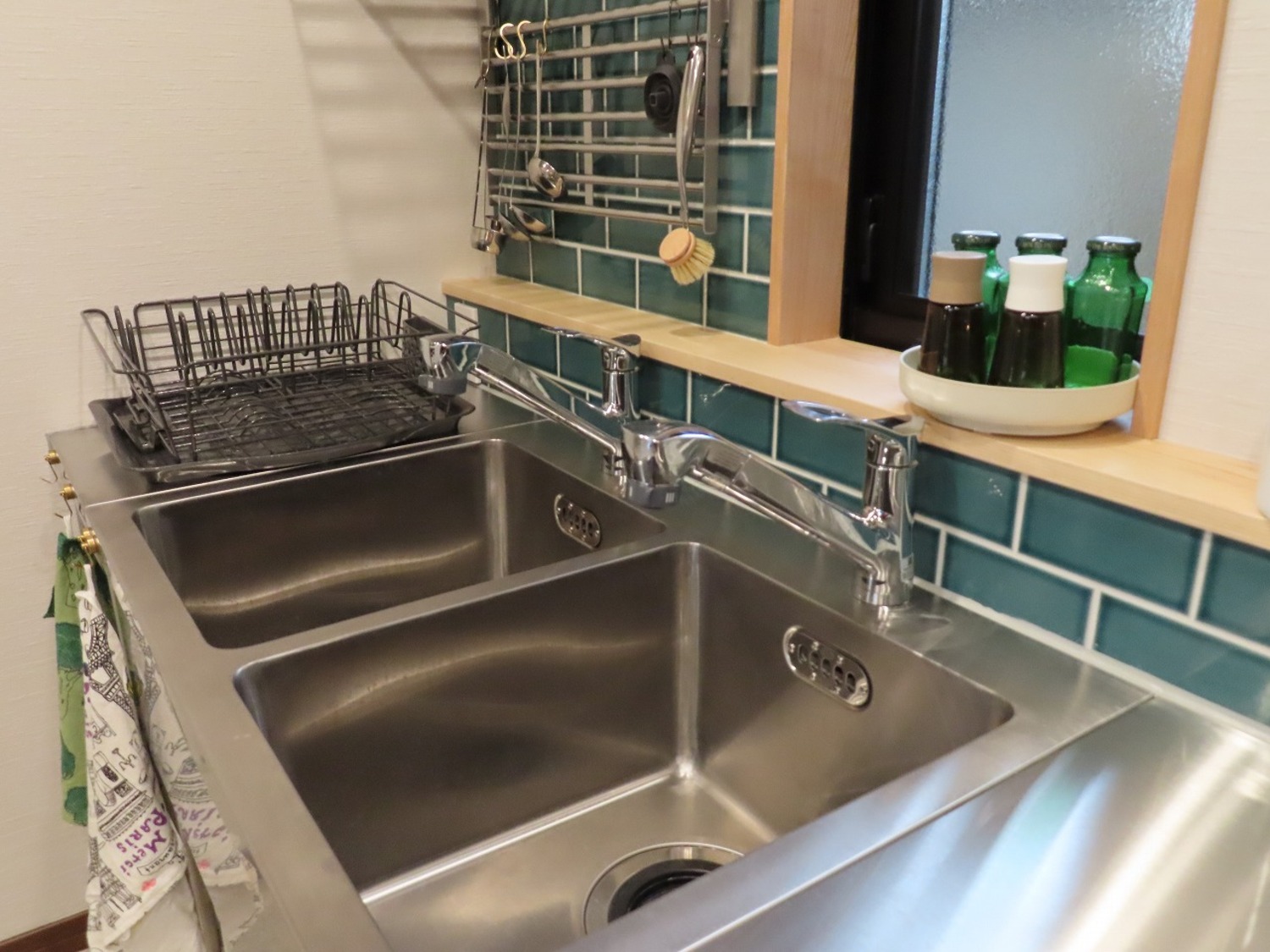 完成写真シンクは保健所からの条件で二層シンクが必須です。水栓も手を使わずに腕などでレバーがあげられる物でないといけません。水栓は壁付けより縦型の方が、スッキリキレイに収まるので設備屋さんに加工してもらいました。