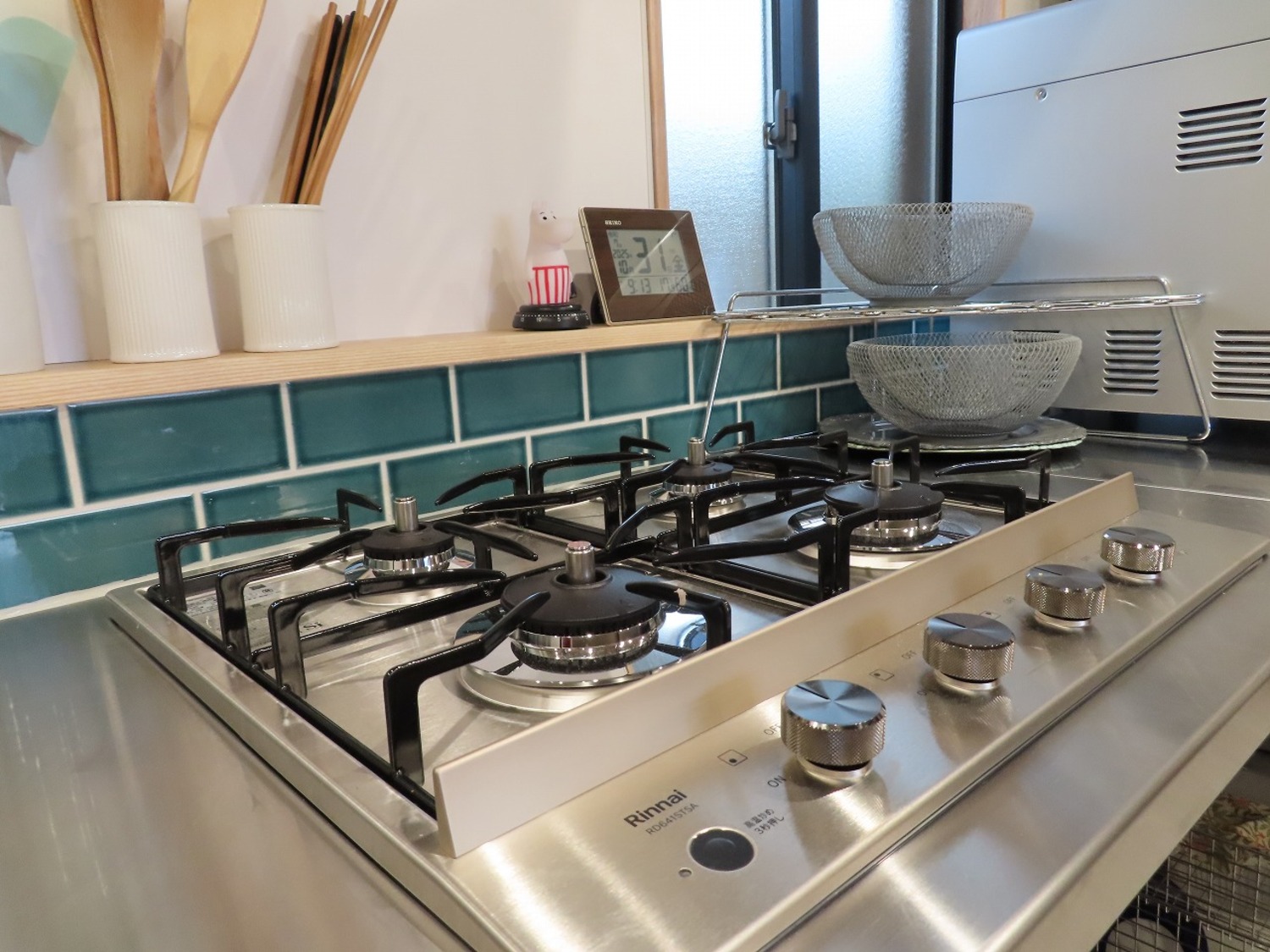 完成写真ガスコンロはリンナイの四つ口のドロップインコンロ。グリルは付いていません。薄型なので、下の部分にはたくさん収納が可能です。