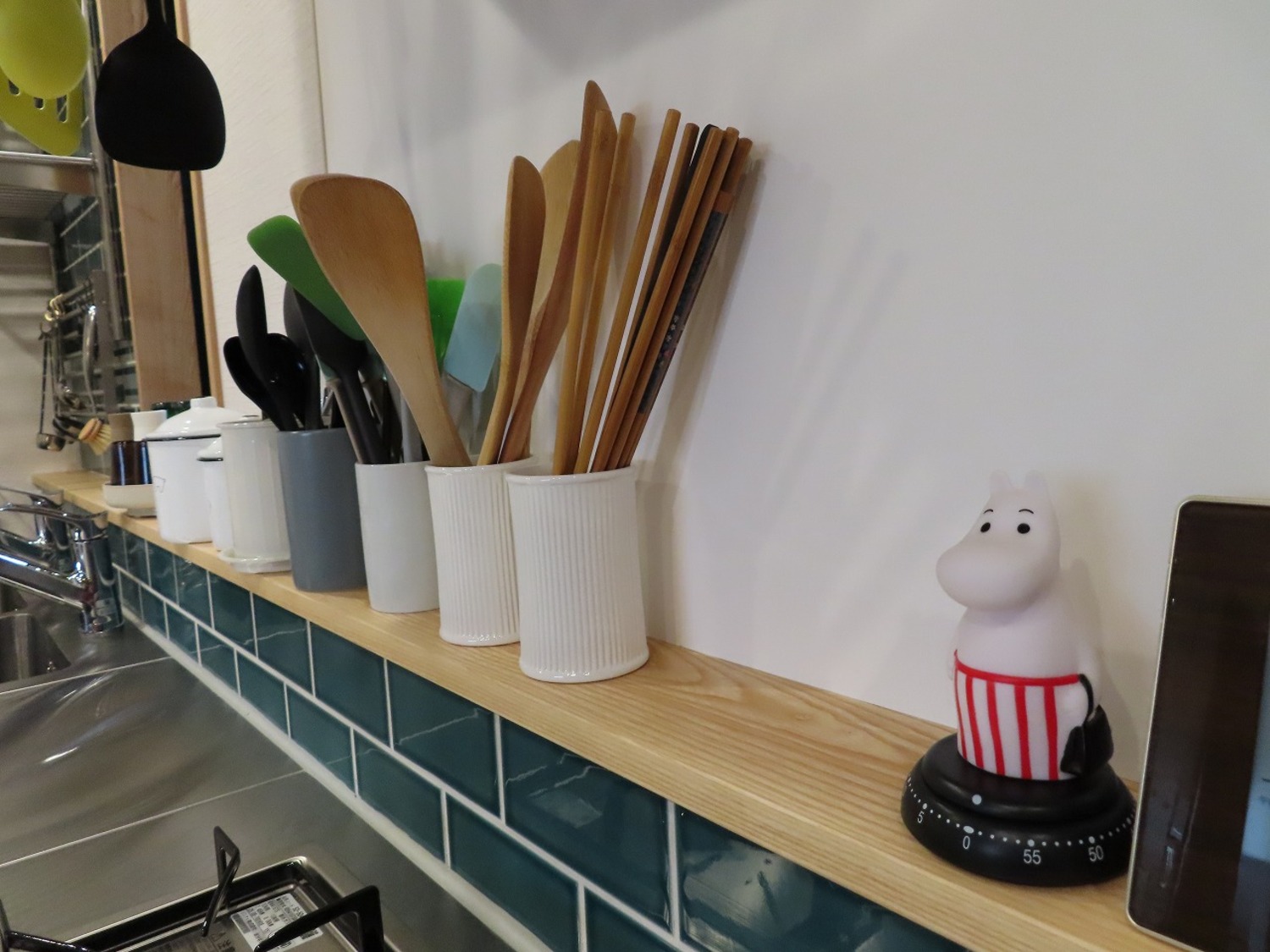 完成写真配管の為にふかし壁にした部分はタイルを貼りオシャレに仕上げました。笠木はキッチンの長さ分あるので、キッチン道具や小物を飾るのに最適です。かわいらしい雑貨に収納して気分も使いやすさも上がります。