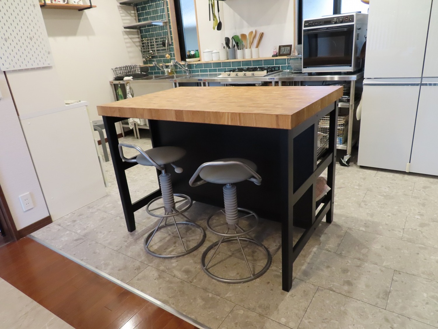 完成写真作業台を置いても、シンク前やコンロ前には十分なスペースがあります。お料理教室の時には、何人もの人が集まるので、キッチンは壁際に一列に並べました。