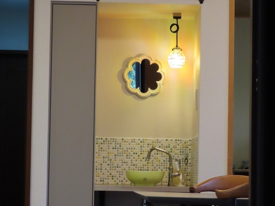 完成写真玄関から入って、正面にはステキな手洗いコーナー。かわいらしい手洗いボールと、モザイクガラスのペンダントライトが目を引きます。